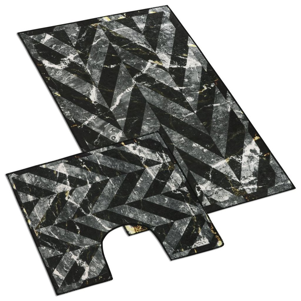 Koupelnová sada obsahuje předložku do koupelny a předložku před WC. Koupelnové předložky jsou vyrobeny z materiálu 100% polypropylen. Předložky nekloužou na podlaze díky protiskluzovému latexovému povrchu na rubní straně. Koupelnu Vám ozdobí elegantní 3D motiv černého mramoru.