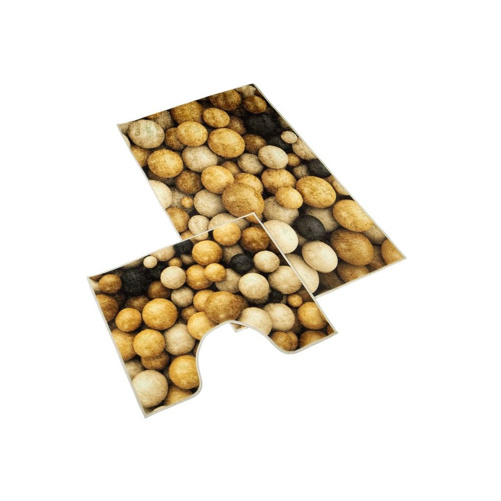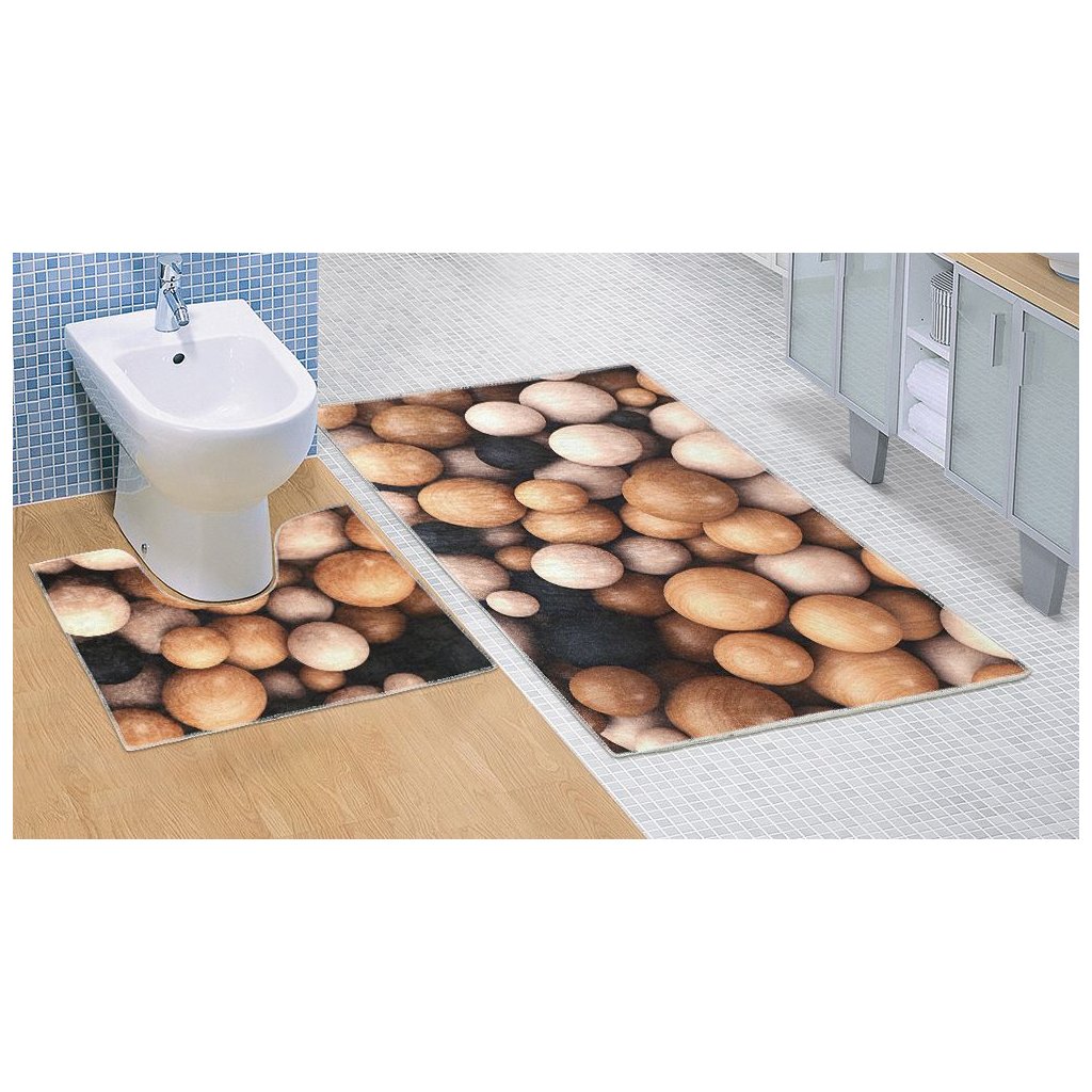 Koupelnová sada obsahuje předložku do koupelny a předložku před WC. Koupelnové předložky jsou vyrobeny z materiálu 100% polypropylen. Předložky nekloužou na podlaze díky protiskluzovému latexovému povrchu na rubní straně. Koupelnu Vám ozdobí velmi moderní 3D motiv hladce opracovaných dřevěných koulí. Předložky jistě skvěle doplní koupelnu laděnou do trendy barev jako je béžová, hnědá a bílá.