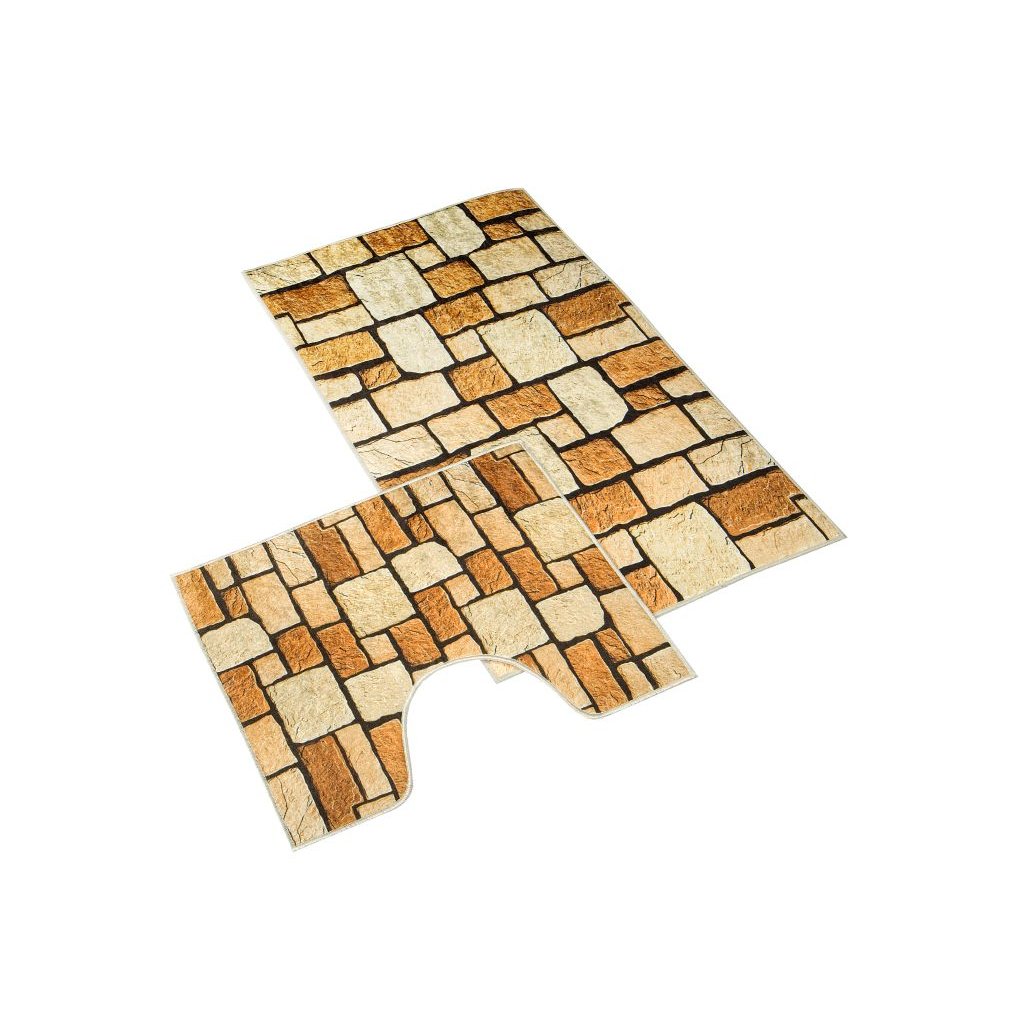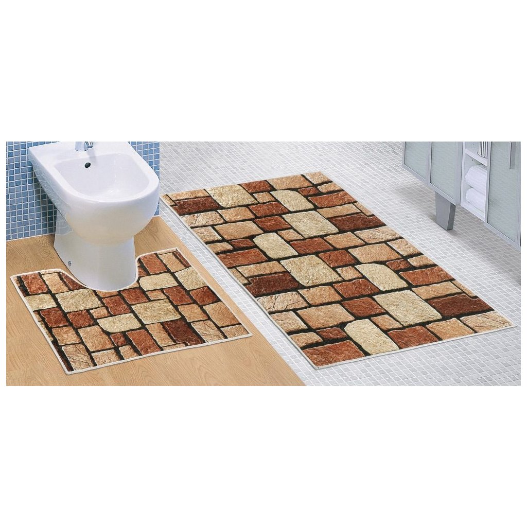 Koupelnová sada obsahuje předložku do koupelny a předložku před WC. Koupelnové předložky jsou vyrobeny z materiálu 100% polypropylen. Předložky nekloužou na podlaze díky protiskluzovému latexovému povrchu na rubní straně. Koupelnu Vám ozdobí velmi moderní 3D motiv kamenné dlažby. Předložky jistě skvěle doplní koupelnu ve venkovském a přírodním stylu.