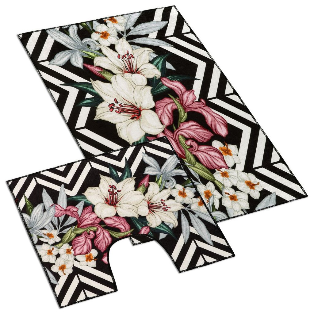 Koupelnová sada obsahuje předložku do koupelny a předložku před WC. Koupelnové předložky jsou vyrobeny z materiálu 100% polypropylen. Předložky nekloužou na podlaze díky protiskluzovému latexovému povrchu na rubní straně. Koupelnu Vám ozdobí 3D motiv kytice lilií.