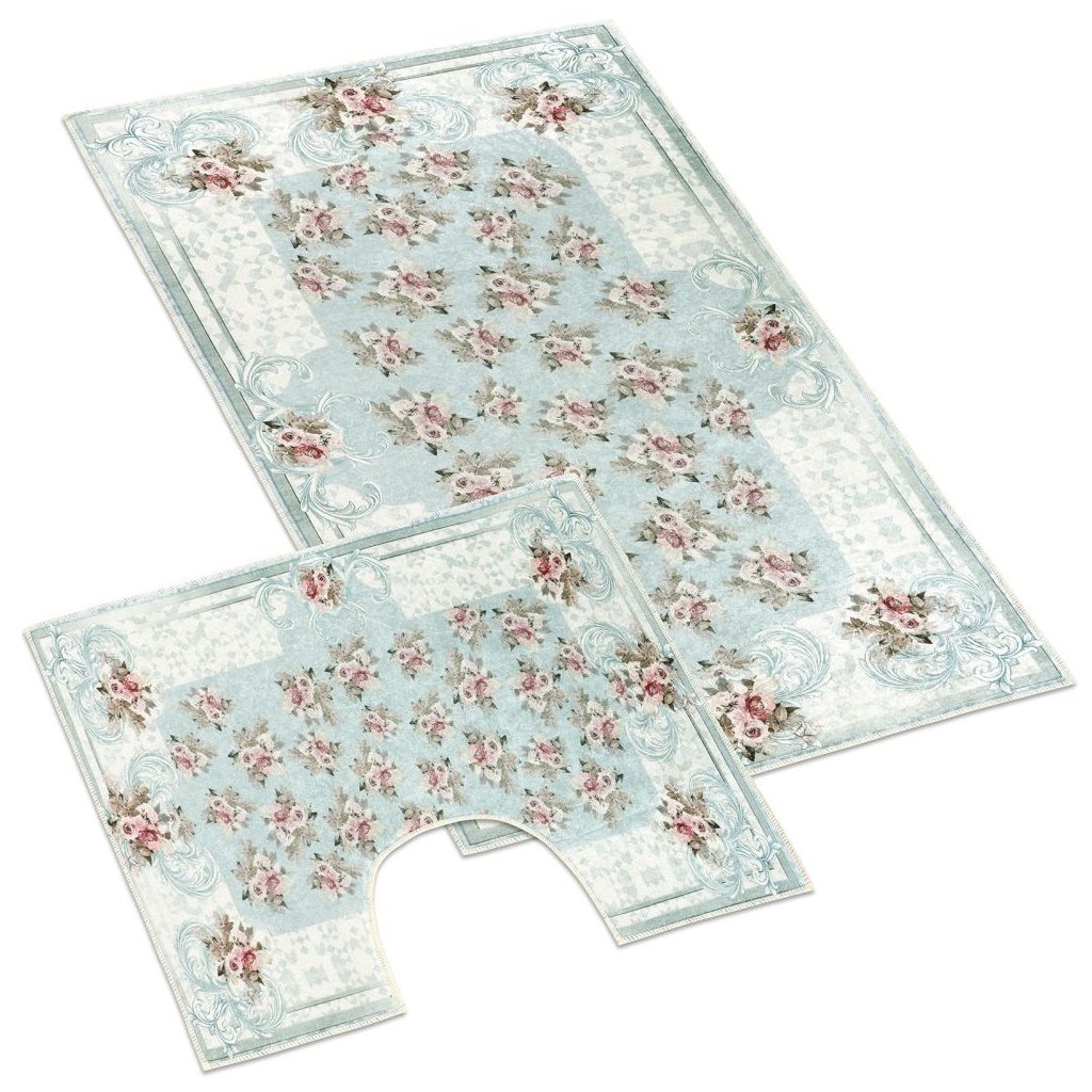 Koupelnová sada obsahuje předložku do koupelny a předložku před WC. Koupelnové předložky jsou vyrobeny z materiálu 100% polypropylen. Předložky nekloužou na podlaze díky protiskluzovému latexovému povrchu na rubní straně. Koupelnu Vám ozdobí jemný 3D motiv s květinovými prvky.