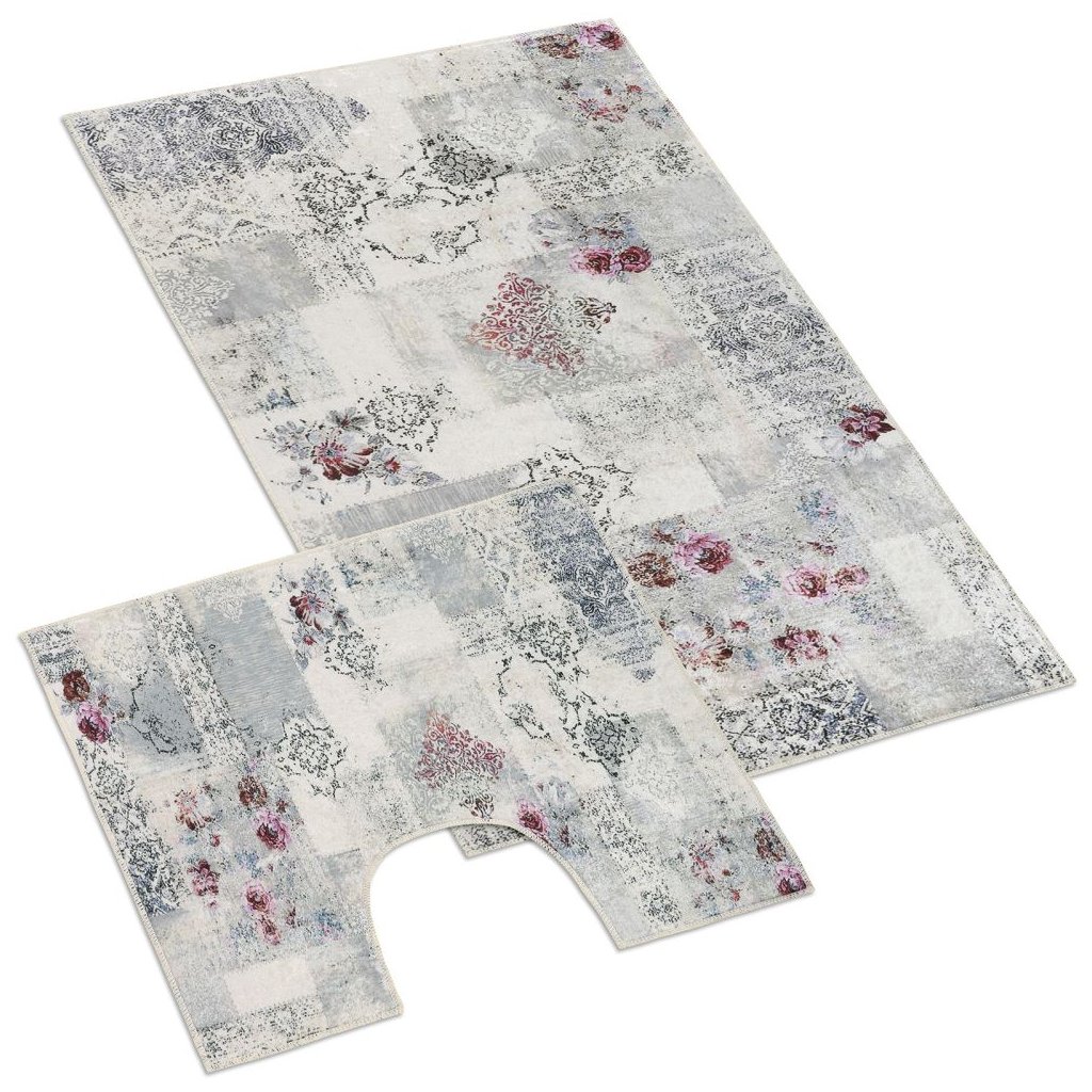 Koupelnová sada obsahuje předložku do koupelny a předložku před WC. Koupelnové předložky jsou vyrobeny z materiálu 100% polypropylen. Předložky nekloužou na podlaze díky protiskluzovému latexovému povrchu na rubní straně. Koupelnu Vám ozdobí orientální 3D motiv s drobnými květy.