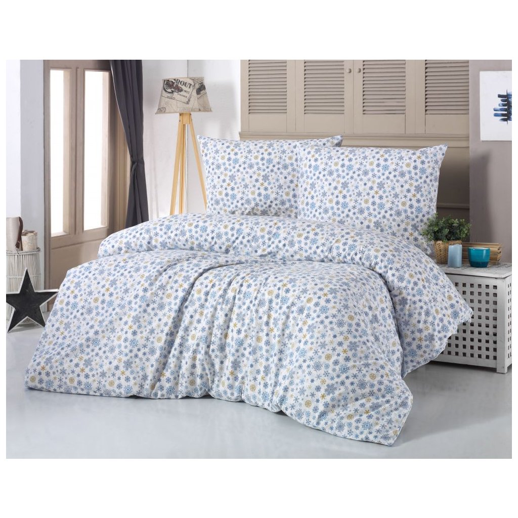 Vánoční ložní povlečení je vyrobeno z velmi jemné tkaniny s vysokou hustotou jemných přízí. Bavlněné vánoční povlečení VLOČKY modrobéžové vnese do Vaší ložnice kouzelnou sváteční atmosféru. Bílé povlečení s modrými a béžovými sněhovými vločkami oceníte nejen během vánočních svátku, ale během celého zimního období.