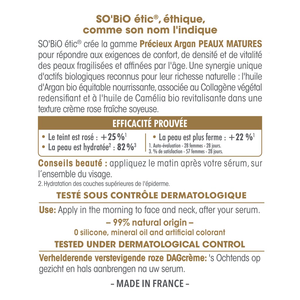 SO’BiO étic Anti-age Precieux Argan Krém růžový denní GOLD BIO (50 ml) je speciálně vytvořen pro potřeby zralé pleti. Jemná textura tohoto přírodního krému bohatého na organický arganový olej pokožku příjemně hydratuje, posiluje její pevnost a dodává tváři svěží rozjasněný vzhled s jemným růžovým tónem. Krém neobsahuje silikony a pyšní se certifikací Ecocert Cosmos Organic. Ráno lehce rozetřete na vyčištěnou pleť, ideálně po nanesení oblíbeného séra.