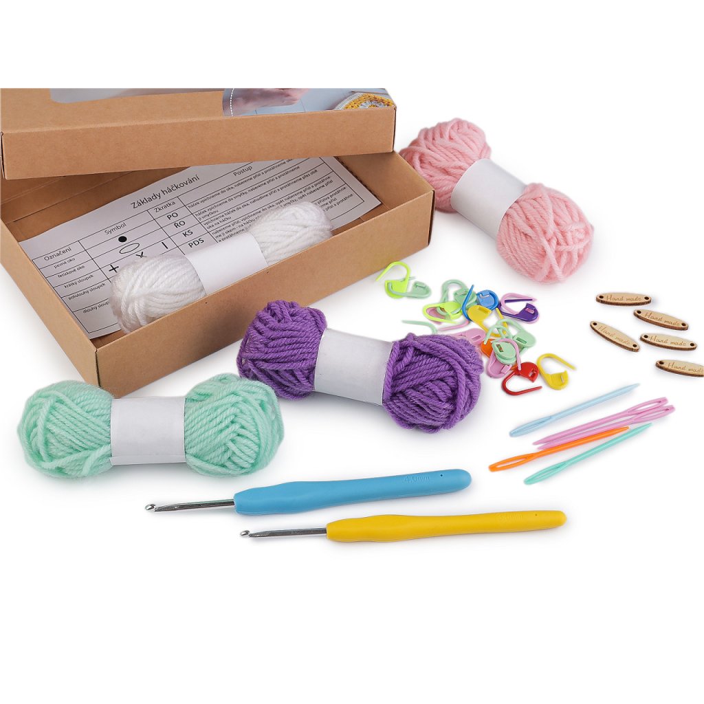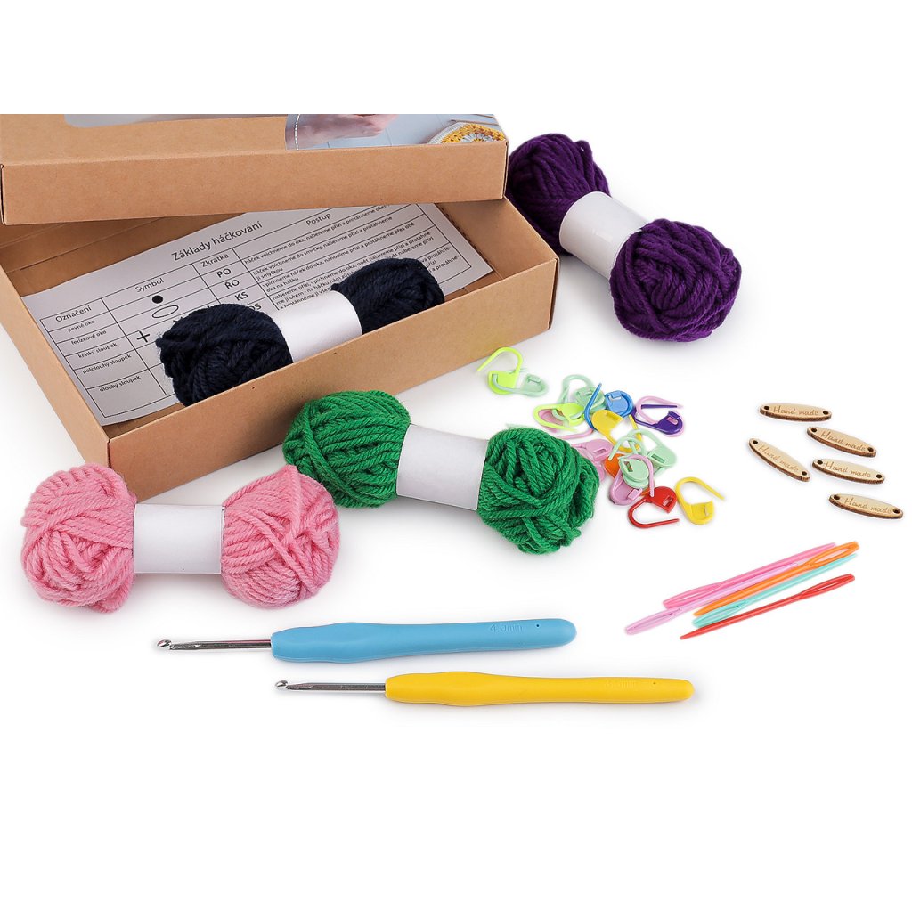 Háčkovací sadu ocení všichni začátečníci. V balení najdete 2 háčky ve velikosti 3,5 a 4 mm, plastové jehly (5 ks), plastové spínací špendlíky (20 ks), dřevěné cedulky "Hand made" (5 ks), příze (4 ks) a návod na základy háčkování.