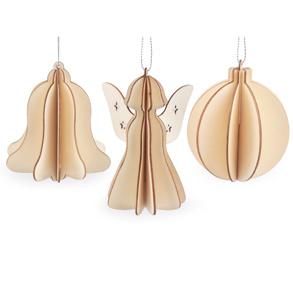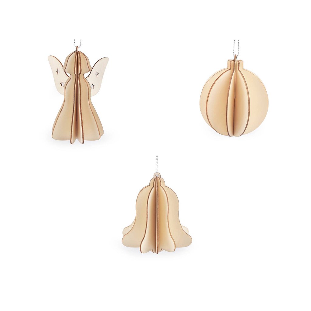 Vánoční dřevěné ozdoby skládací baňka, zvonek, anděl
