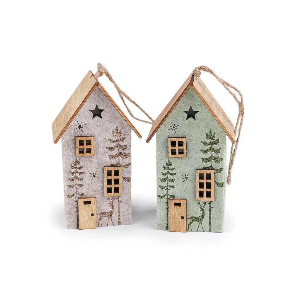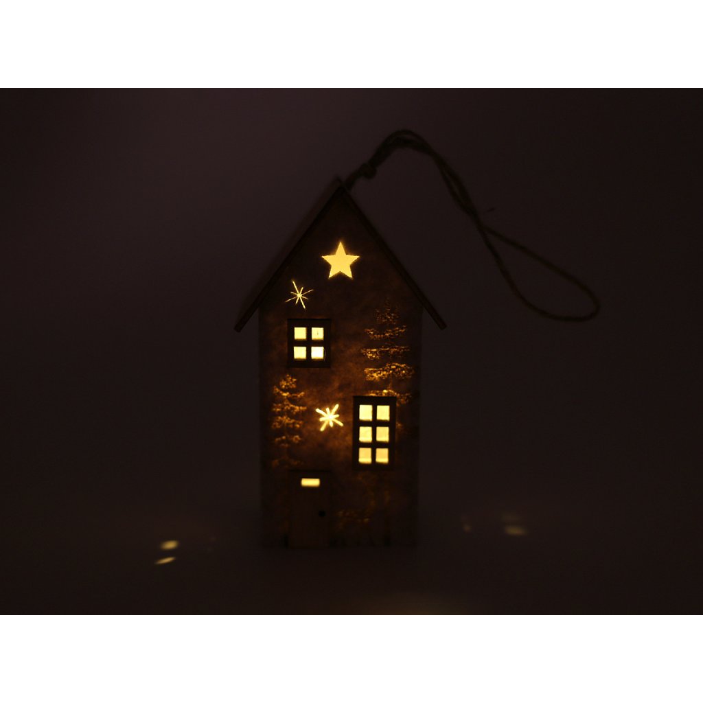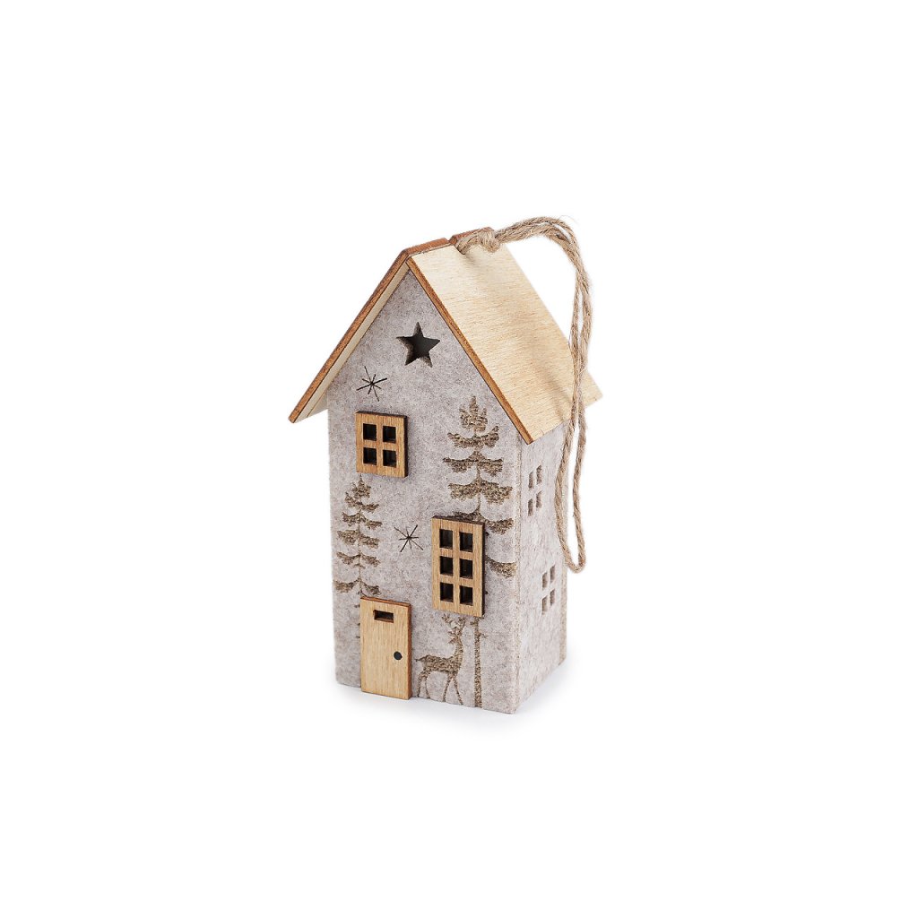 Svítící dekorační domeček má základ z pevného filcu a střechu a detaily ze dřeva. Přední stranu zdobí motiv lesa s jelenem a výřezy hvězd. Svítí příjemným teplým světlem, které zútulní každý interiér. Díky poutku ho můžete pověsit na větvičky ve váze, na věnce i na vánoční stromeček.