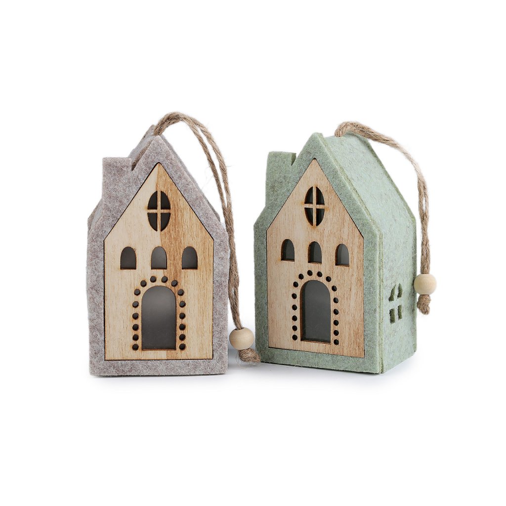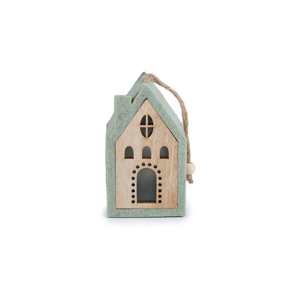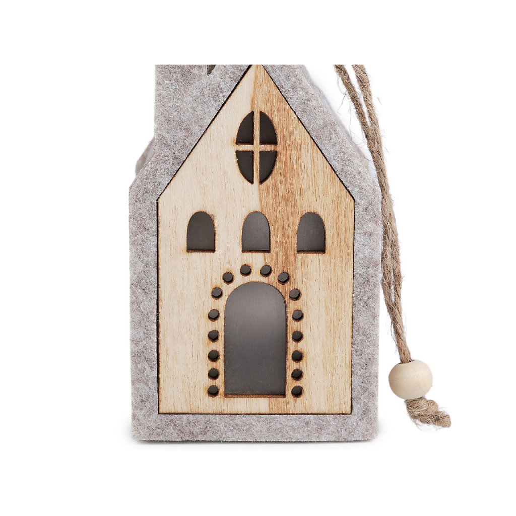 Svítící domeček je vyrobený z kombinace dřeva a pevného filcu. Svítí příjemným teplým světlem, které vypadá jako hvězdička. Díky poutku ho můžete pověsit na větvičky ve váze, na věnce i na vánoční stromeček.
