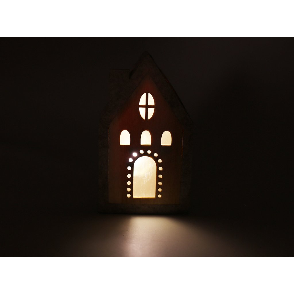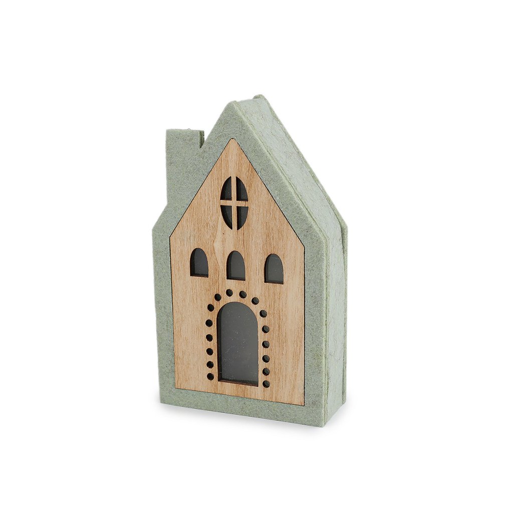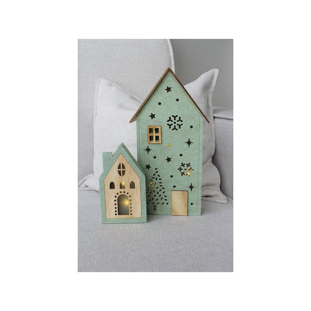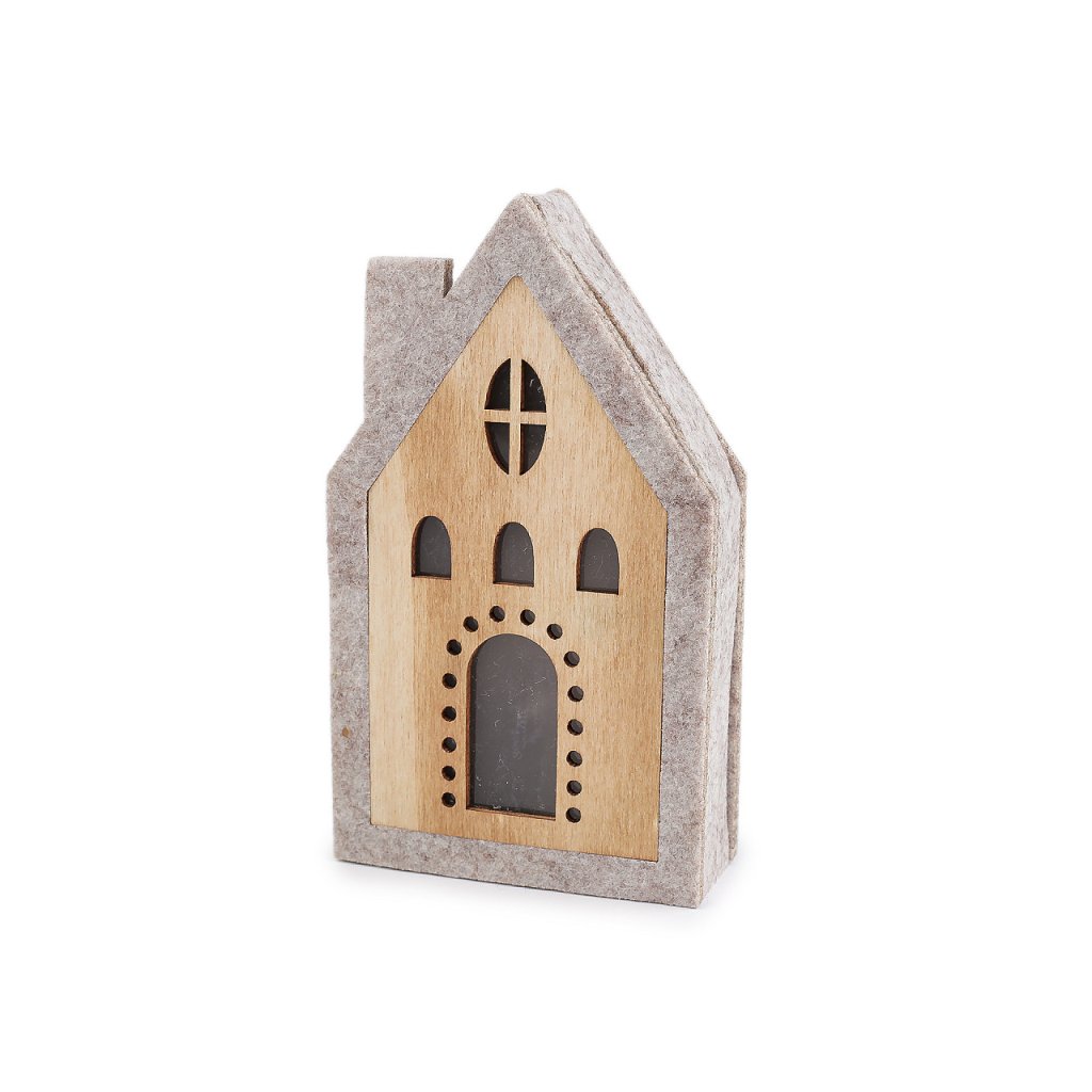 Svítící domeček je vyrobený z kombinace dřeva a pevného filcu. Svítí příjemným teplým světlem, které vypadá jako hvězdička. Dodá hřejivou a poklidnou atmosféru do každého interiéru.