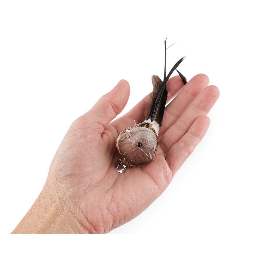 Dekorační ptáček zaujme svým jemným zpracováním a přírodním vzhledem. Vynikne na větvičkách, záclonách, věncích, v květinových vazbách a různých aranžmá. V dolní části má kovový klip, který umožňuje jednoduché připevnění.