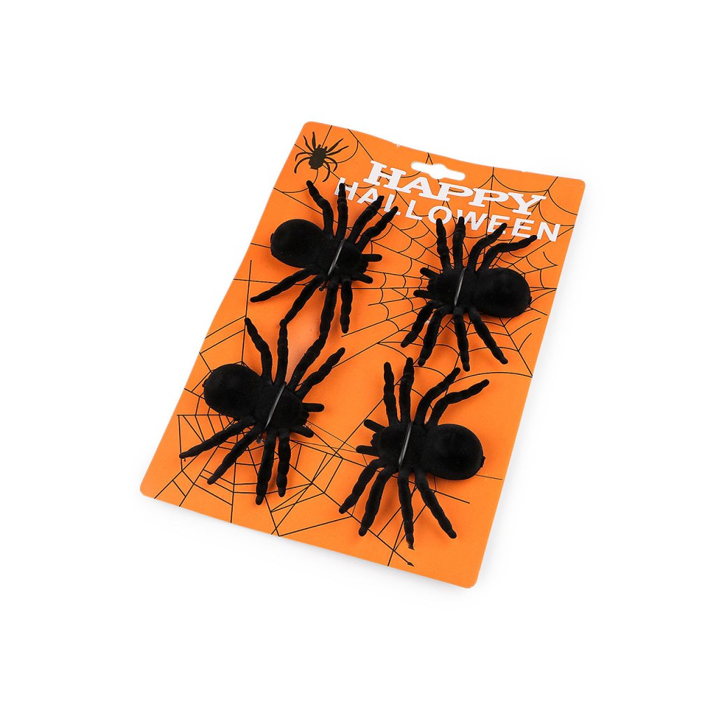 Balení obsahuje 4 ks pavouků, kteří jsou připevnění drátky k papírové kartě s potiskem pavučin a nápisem Happy Halloween.