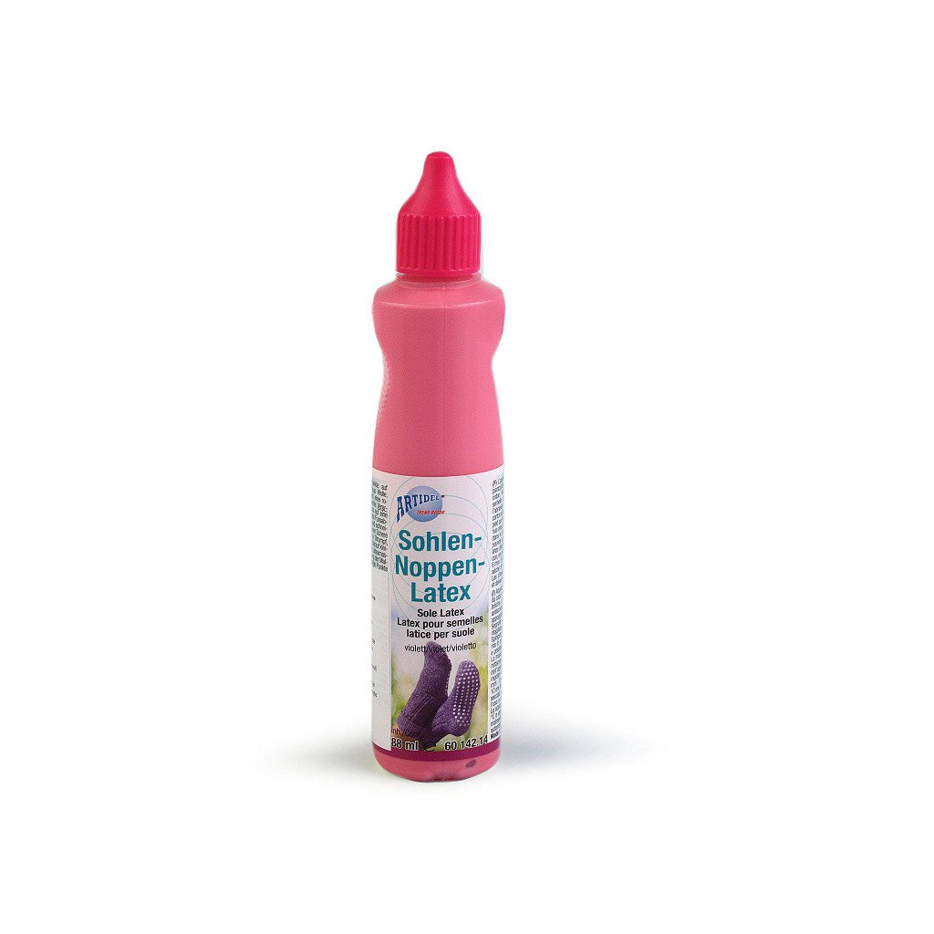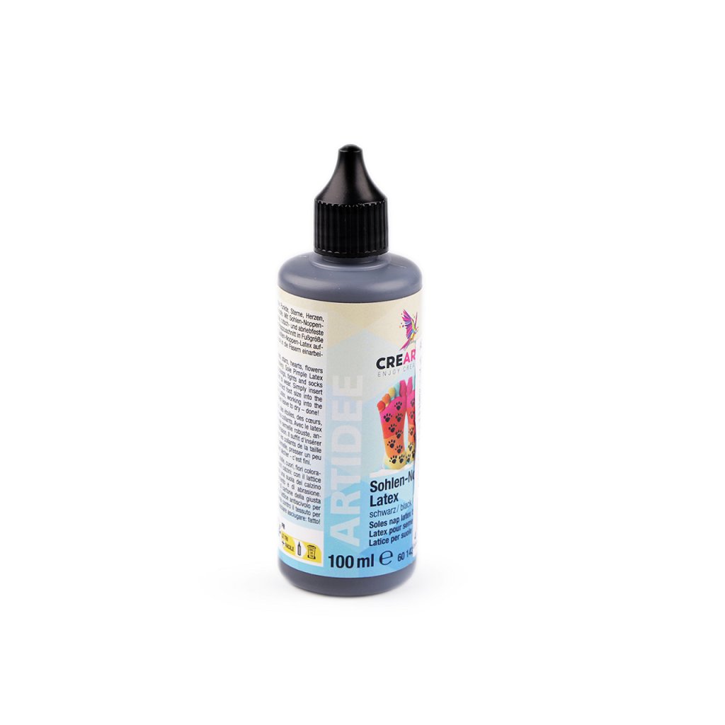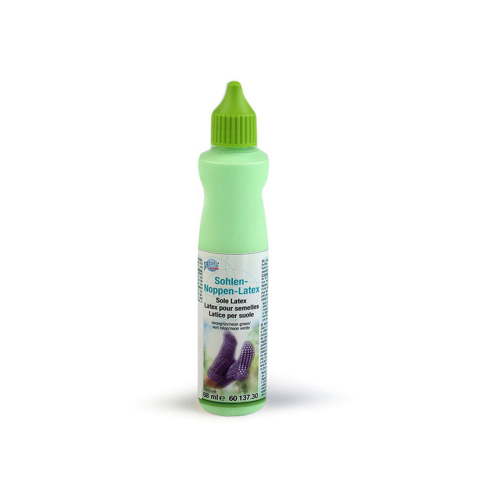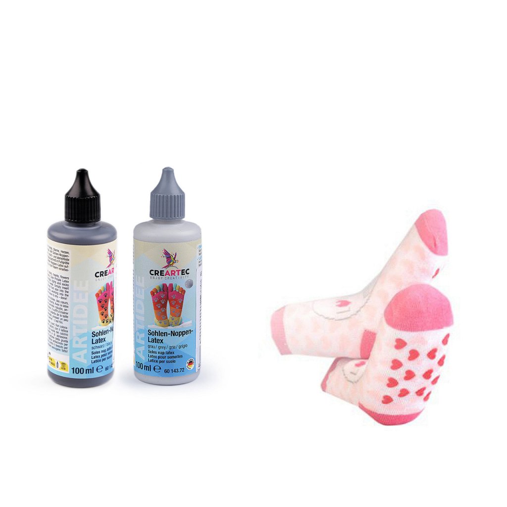 Návod k použití: položte nohu na pevnou lepenku. Obtáhněte kontury chodidla fixem a otisk vystřihněte nůžkami. Vsuňte lepenku do vybrané ponožky nebo punčochy, aby se vytvořila pevná podrážka a mohli jste na ni nanést malé latexové tečky. Latexová hmota se přímo nanáší tenkým otvorem v trysce na lahvičce. Špičku lahvičky je nutné více zastrčit do látky a pak postupně pomalu vytahovat nahoru, aby se latex dostal přímo do struktury a neulpěl jen na povrchu vláken. Vytvářejte malé puntíky v rozmezí 5-6 mm. Doba schnutí je 8-10 hodin. Poté vyjměte lepenku. Ponožky či punčochy jsou pak ihned připraveny k použití.