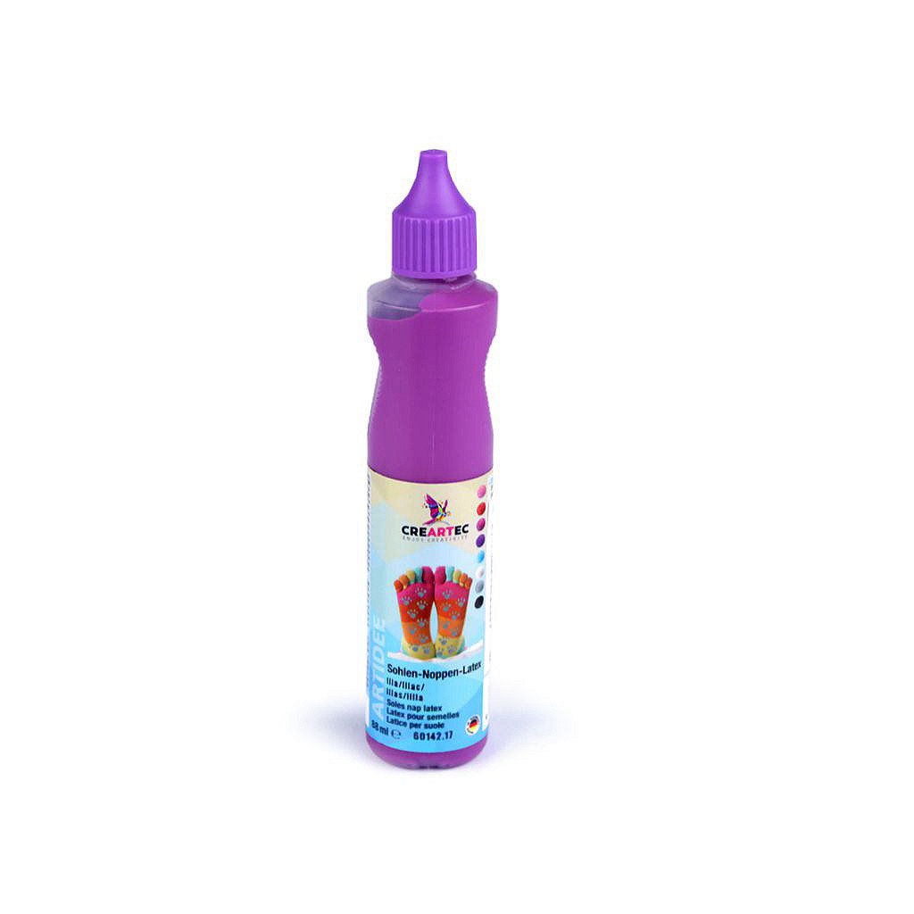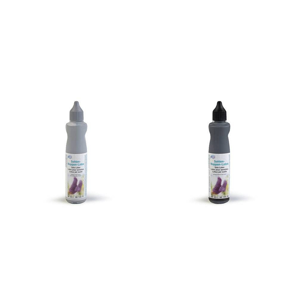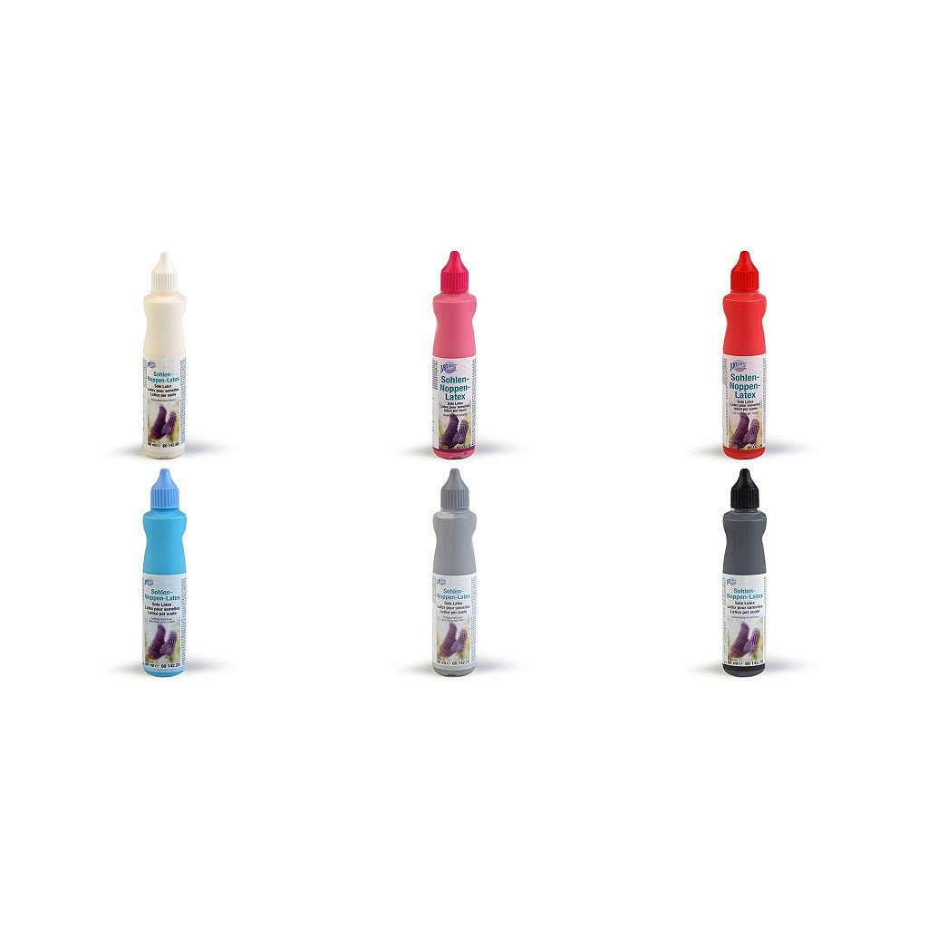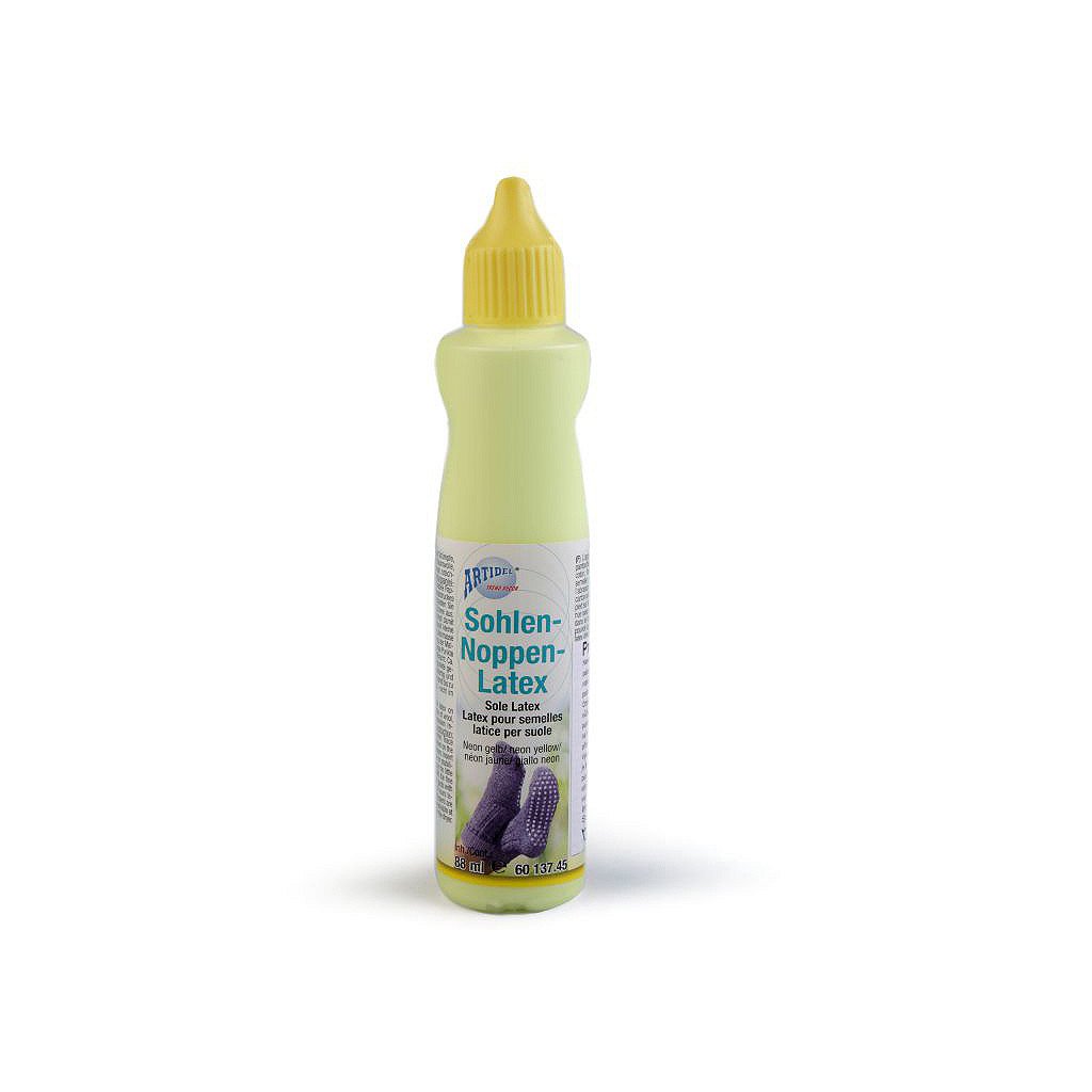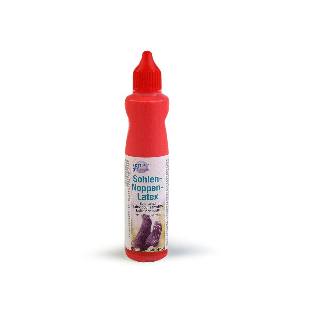 Návod k použití: položte nohu na pevnou lepenku. Obtáhněte kontury chodidla fixem a otisk vystřihněte nůžkami. Vsuňte lepenku do vybrané ponožky nebo punčochy, aby se vytvořila pevná podrážka a mohli jste na ni nanést malé latexové tečky. Latexová hmota se přímo nanáší tenkým otvorem v trysce na lahvičce. Špičku lahvičky je nutné více zastrčit do látky a pak postupně pomalu vytahovat nahoru, aby se latex dostal přímo do struktury a neulpěl jen na povrchu vláken. Vytvářejte malé puntíky v rozmezí 5-6 mm. Doba schnutí je 8-10 hodin. Poté vyjměte lepenku. Ponožky či punčochy jsou pak ihned připraveny k použití.