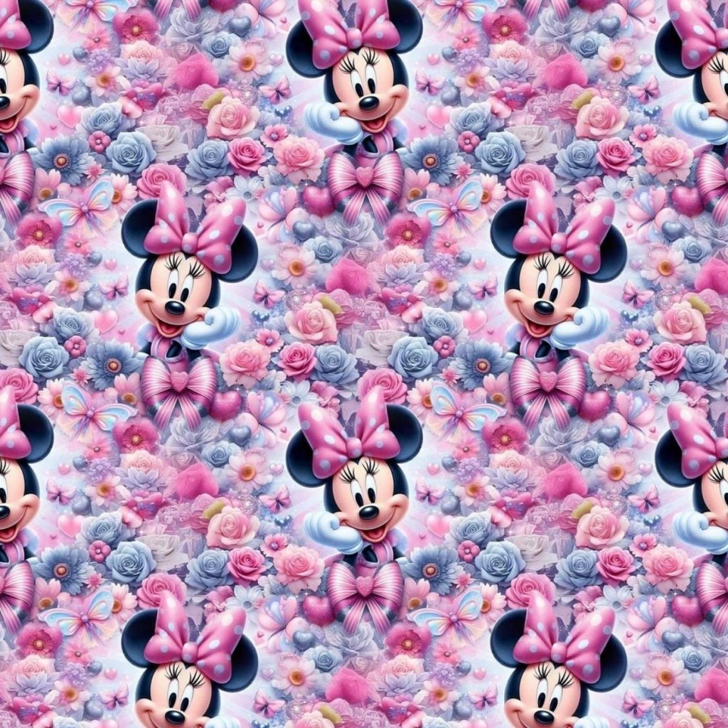 Prémiový bavlněný úplet s elastanem s motivem myšky Minnie na růřovém podkladu je skvělou volbou pro milovníky této myšky. Tento kvalitní materiál s odolným potiskem si zachovává svůj vzhled i po opakovaném praní.
