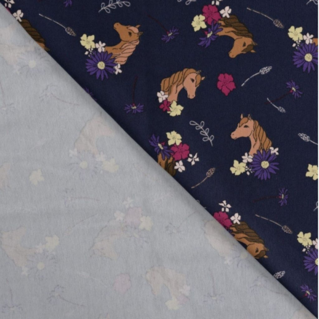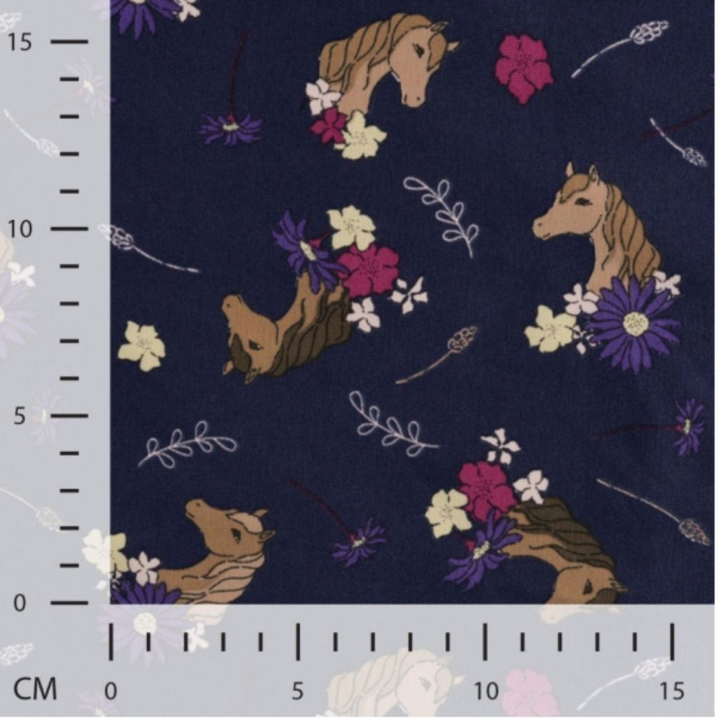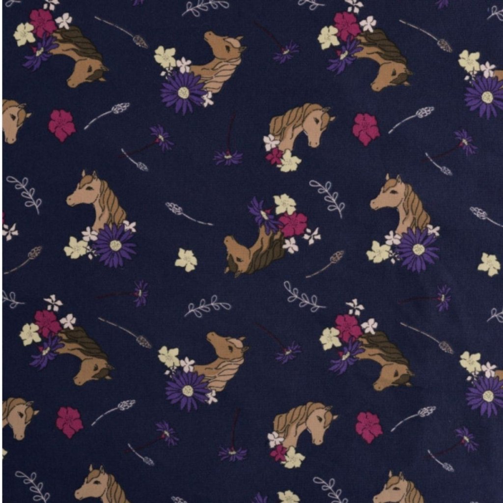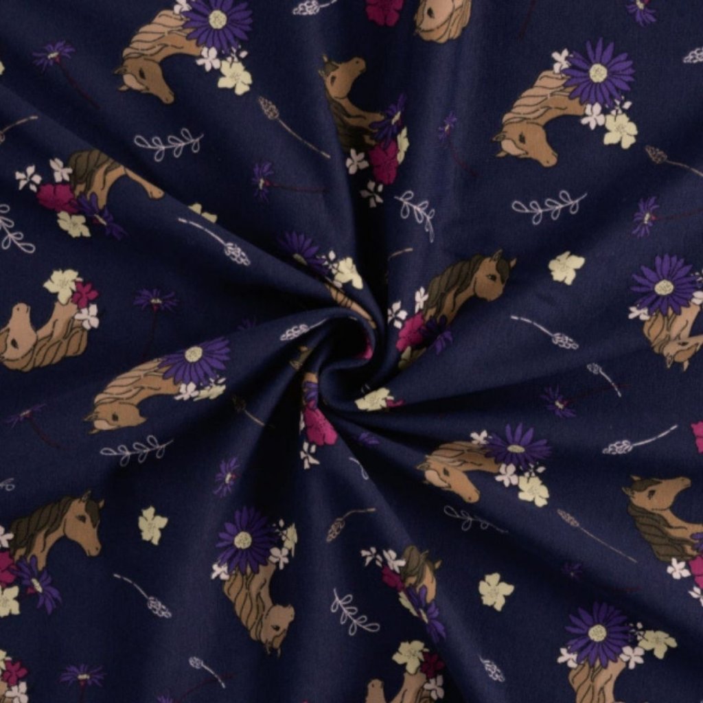 Úplet Květinoví koníci vás okouzlí svým originálním vzorem – hlavičky koní obklopené lučními květy na elegantním tmavě modrém podkladu. Tento bavlněný úplet s elastanem je jemný na dotek, prodyšný a díky přidanému elastanu krásně pruží do šířky i do délky.