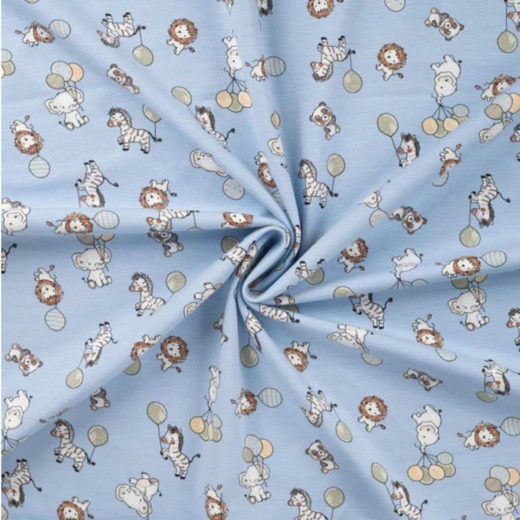 Bavlněný úplet s roztomilými safari zvířátky na světle modrém podkladu.