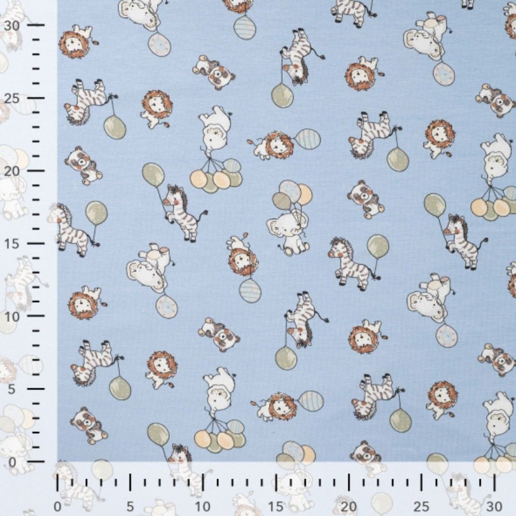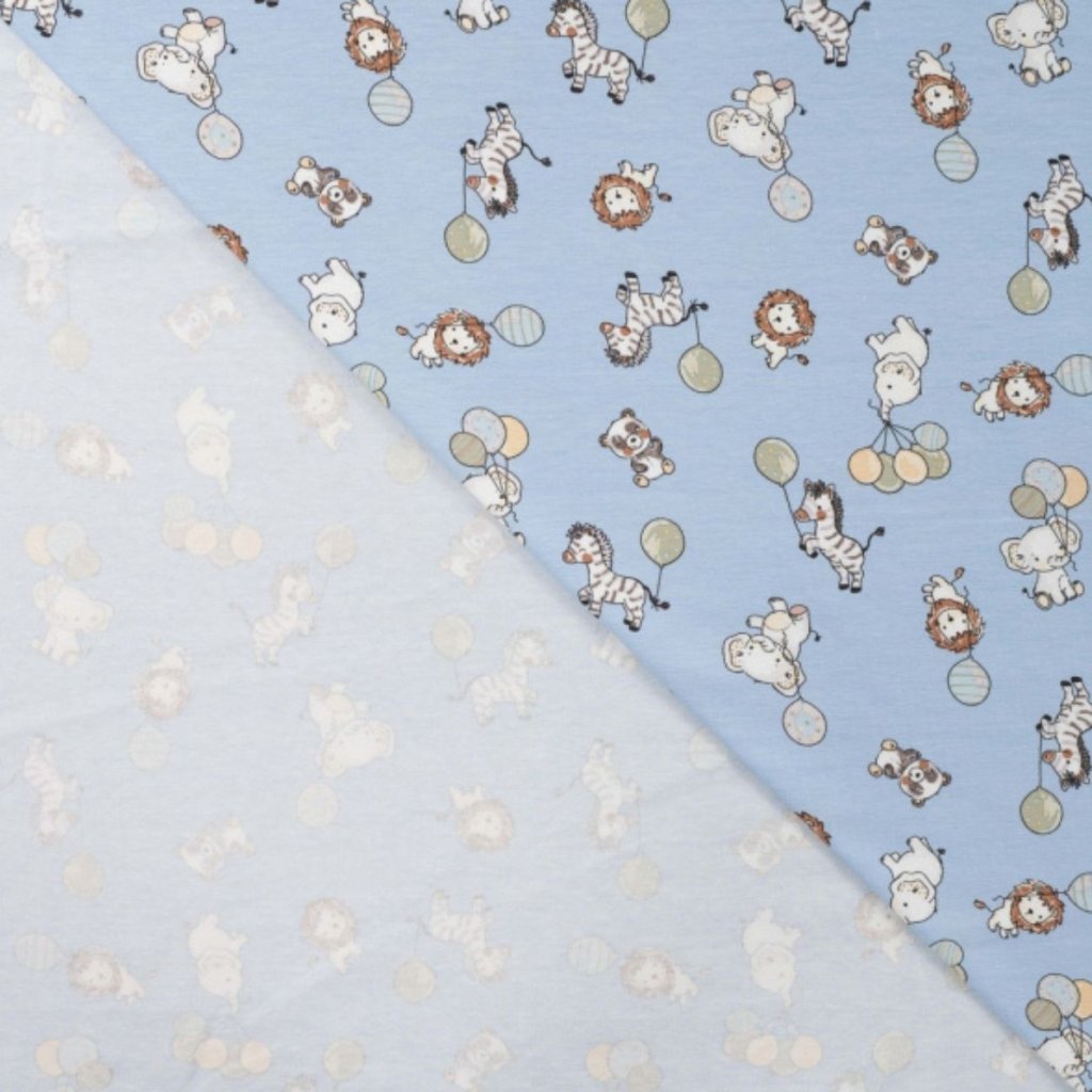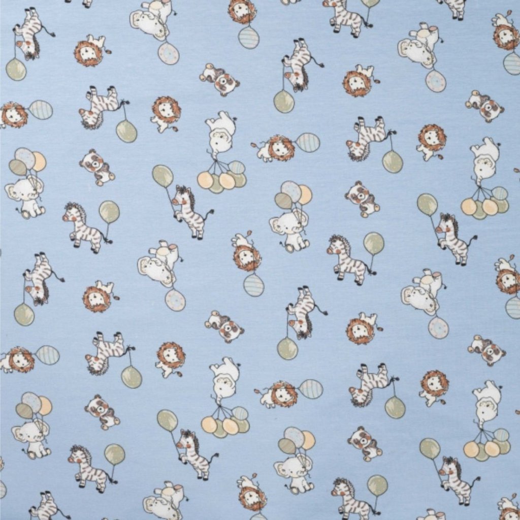 Úplet Safari kamarádi si okamžitě zamilujete díky jeho hravému potisku. Na světle modrém podkladu dovádí roztomilé lvíčci, zebry, žirafky a sloníci s balónky, což z něj dělá ideální látku pro děti.