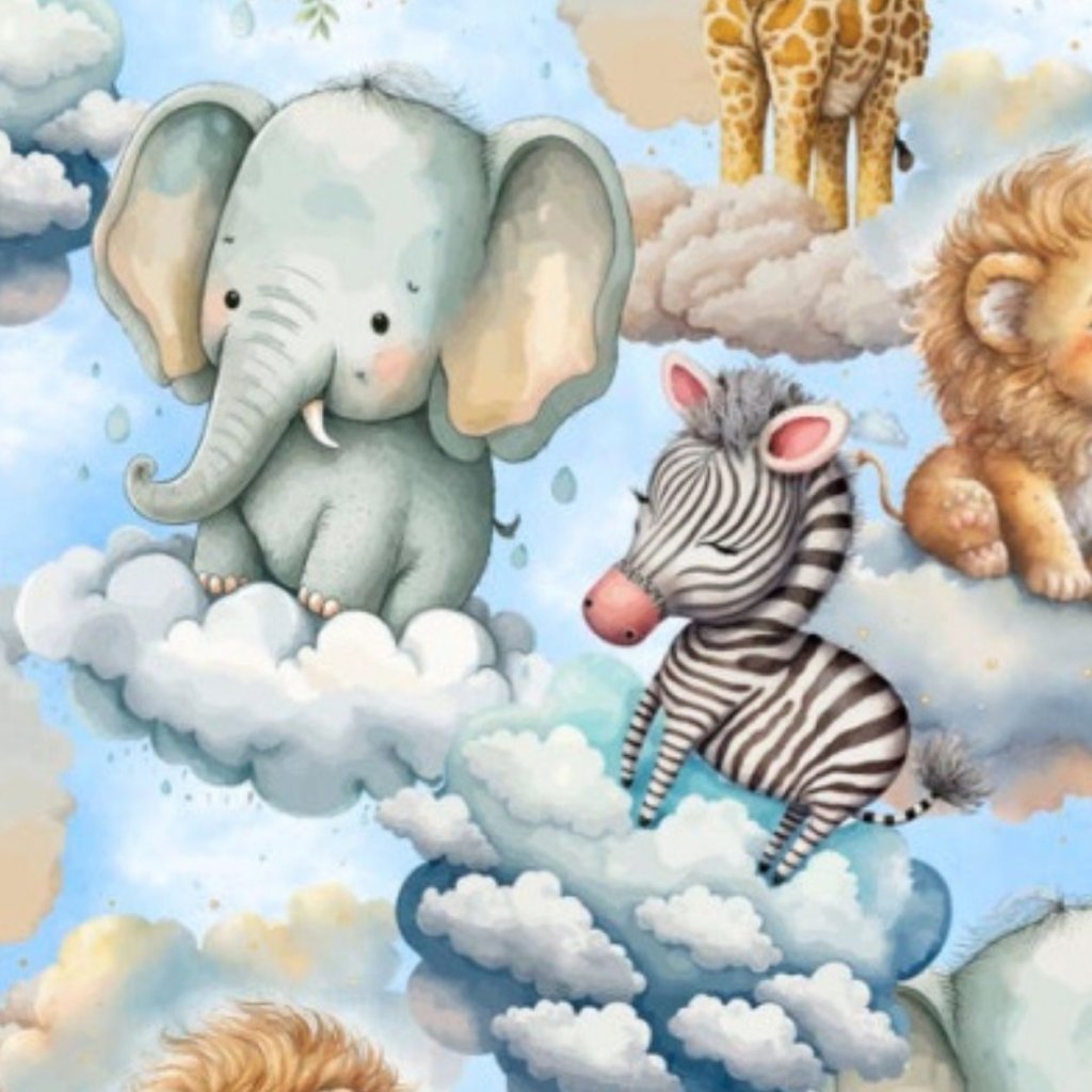 Pokud hledáte látku, která rozzáří dětský šatník a vnese hravost do každého modelu, Safari v oblacích je ta pravá volba.