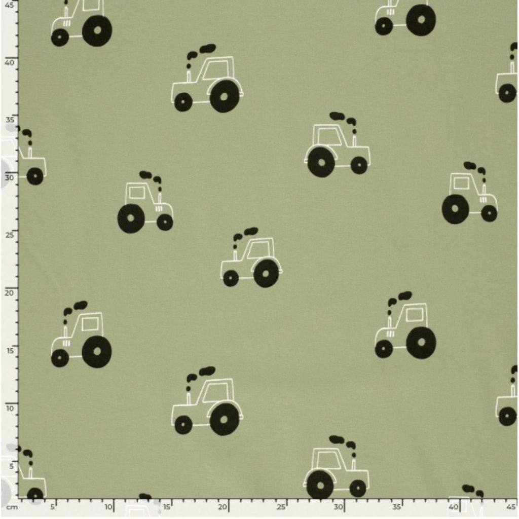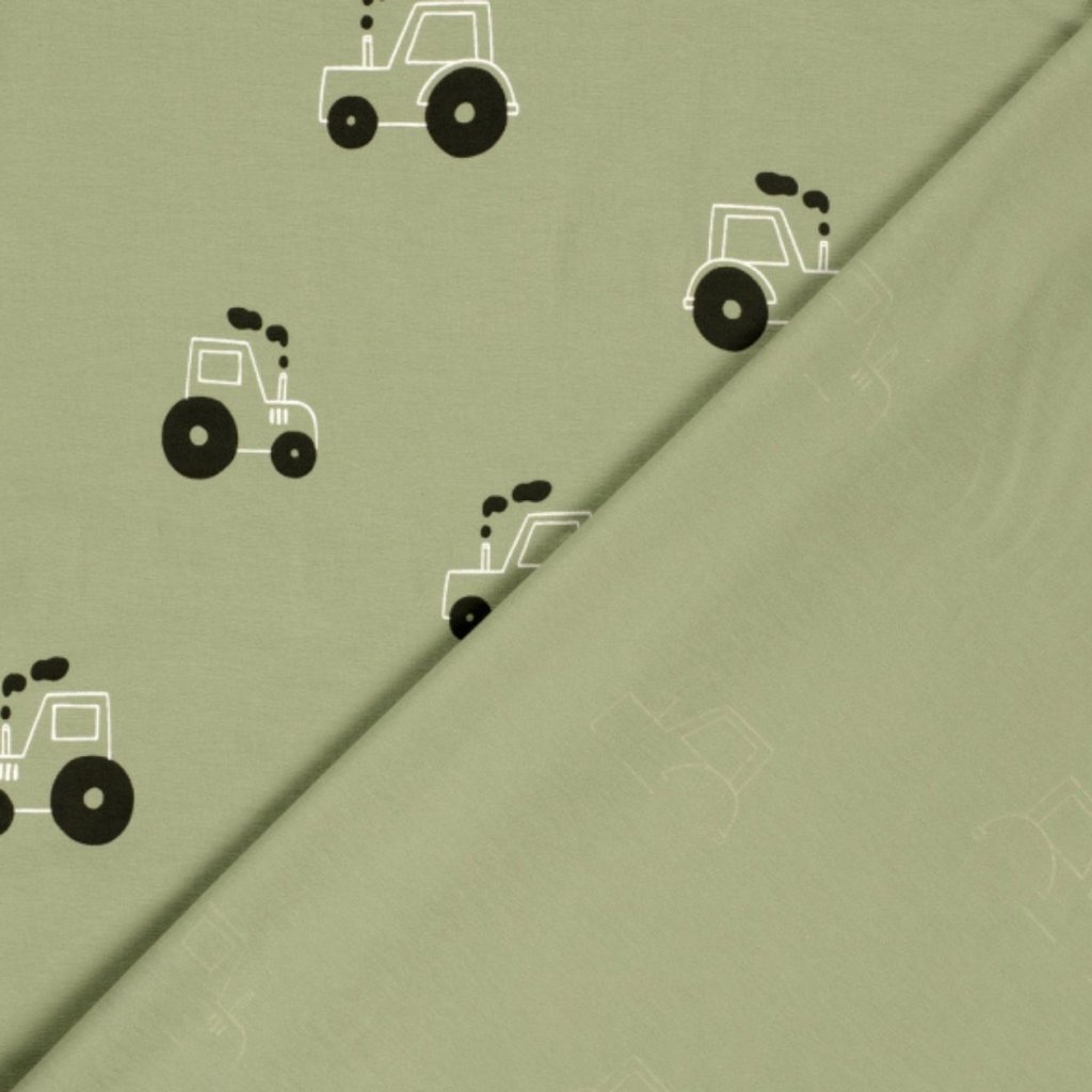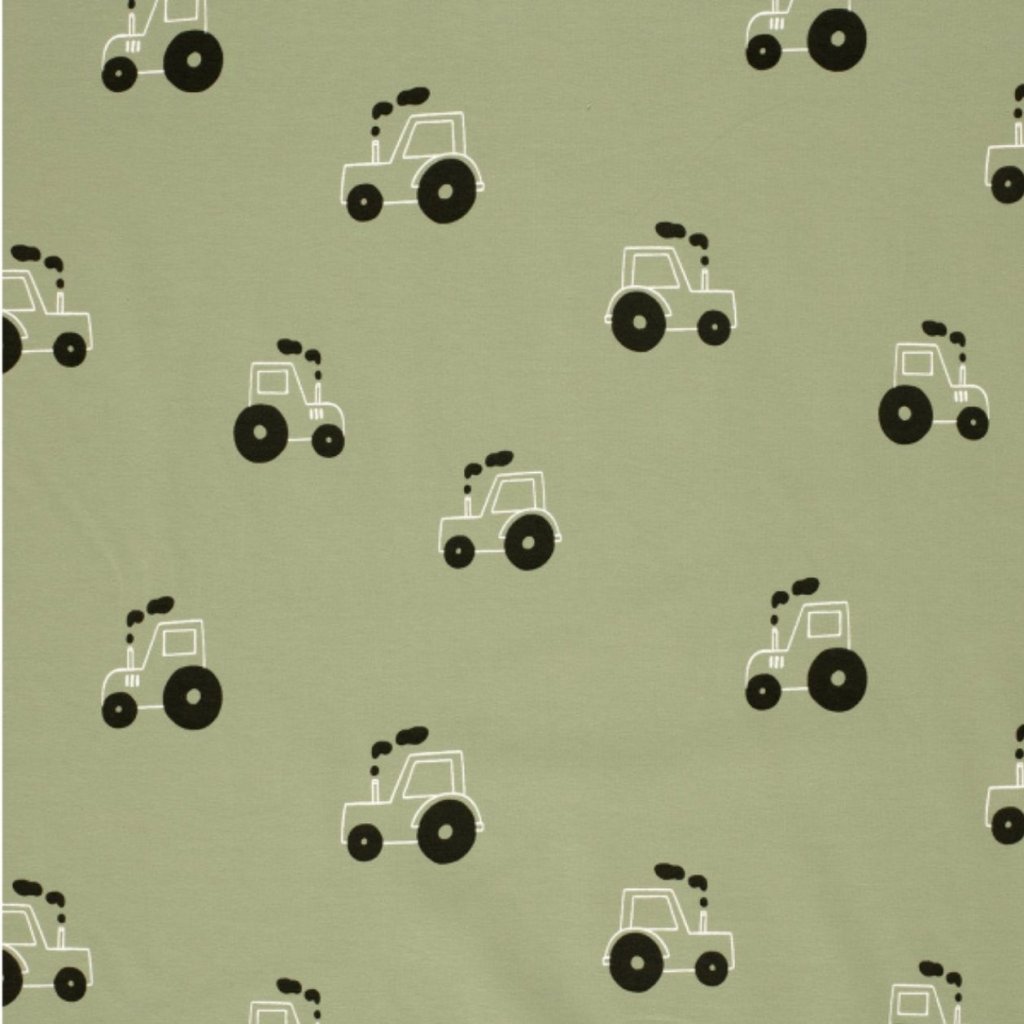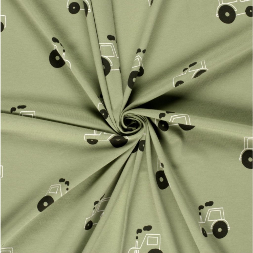 Bavlněný úplet s potiskem traktorů na zeleném podkladu.