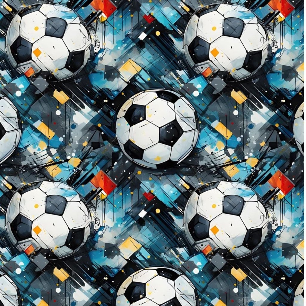 Prémiový bavlněný úplet s motivem fotbalových míčů ve stylu street artu. Ideální na trička, mikiny i pohodlné oblečení pro kluky i teenagery, kteří milují pohyb a energii.