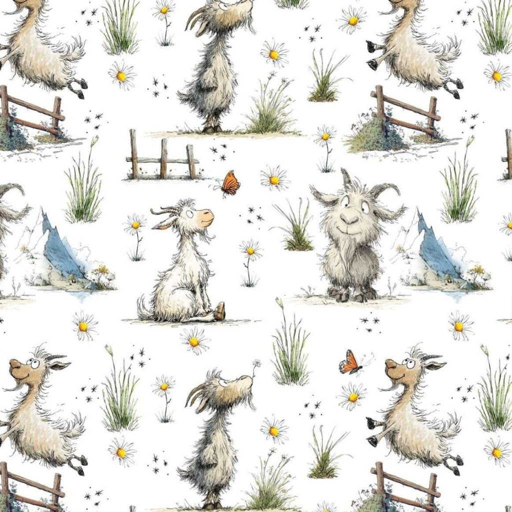 Kozlíci v různých pozicích, drobné květiny, traviny i motýlci vytváří krásný příběhový motiv, který si zamilují děti i dospělí. Látka je ideální pro všechny, kdo mají rádi jemné, originální a „neokoukané“ vzory.