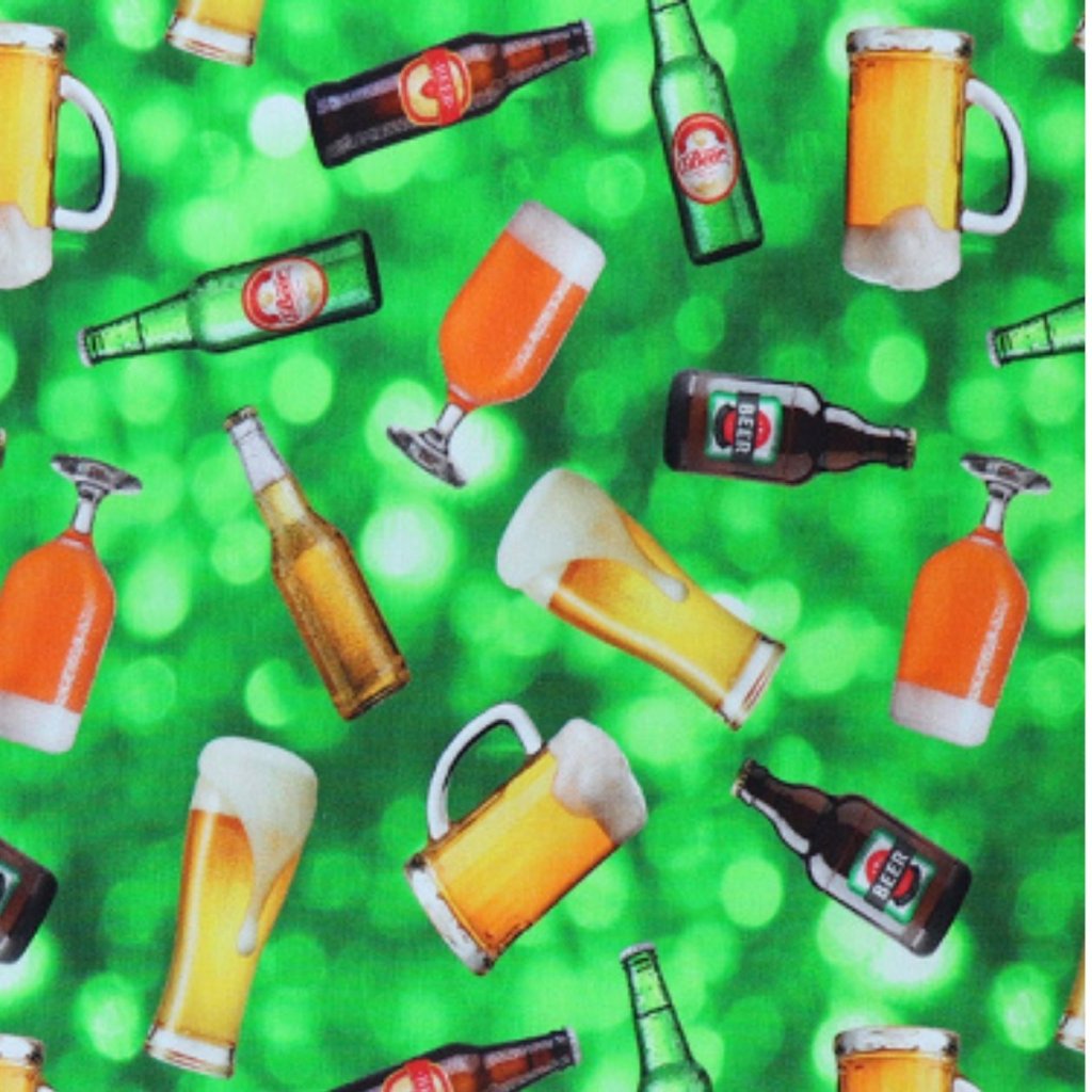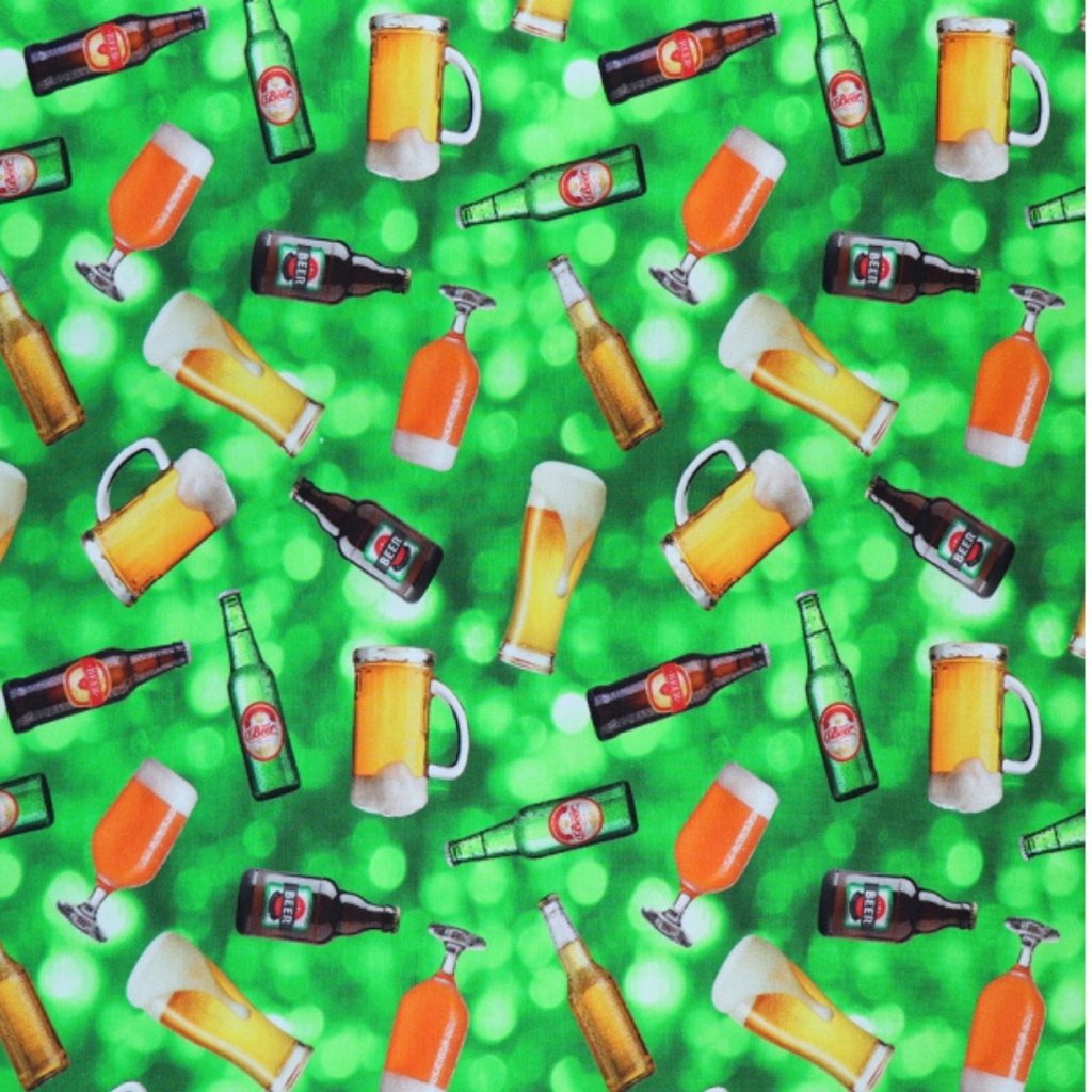 Bavlněný úplet s veselým pivním motivem – půllitry, lahve i sklenice piva na zeleném podkladu.