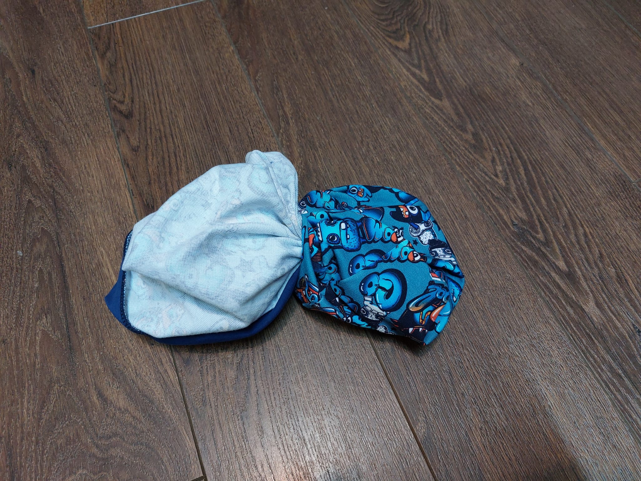1) Nejprve si připravíme dva obdélníky. Jeden bude lícová strana nákrčníku (látka se vzorem) a druhý rubová vnitřní strana nákrčníku (jednobarevná látka). V našem případě jsme zkombinovali nepočesanou teplákovinu a úplet. Velikost obdélníku spočítáme tak, že změříme obvod hlavy, od něj odečteme 2 cm a tím získáme rozměr delší strany. Výšku nákrčníku, tedy rozměr kratší strany, zvolíme cca 25 cm. Záleží na tom, jak vysoký nákrčník chceme. Někdo má raději vyšší, někdo nižší :-)