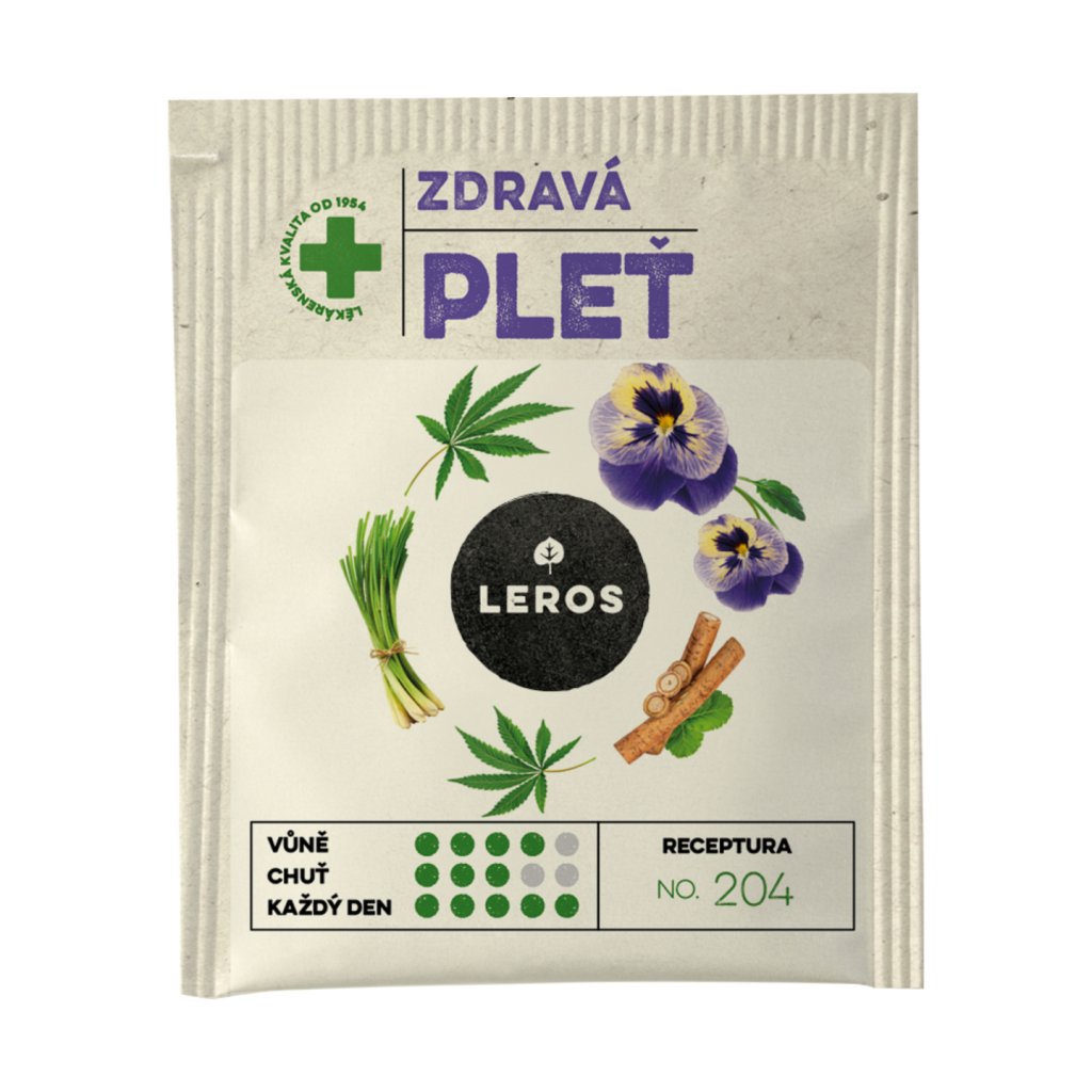 Bylinný čaj LEROS Zdravá pleť nabízí vyváženou směs konopí, violky trojbarevné, lopuchu a citronové trávy, které přispívají k přirozené péči o pleť a její zdraví a jsou tradičně využívány při kožních potížích nebo při projevech stárnutí pokožky. Jemně svěží chuť s bylinkovými tóny potěší smysly a osvěží tělo i mysl. Čaj je bez lepku, umělých sladidel či konzervantů a vhodný také pro vegany. Stačí vyluhovat jeden sáček v horké vodě a vychutnat si šálek přírody každý den.