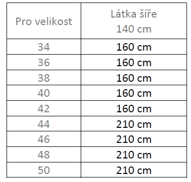 Pro jinou šíři látky je vhodné určit si spotřebu látky individuálně vyskládáním střihu na vaši šíři. V některých případech lze výrazně ušetřit.
