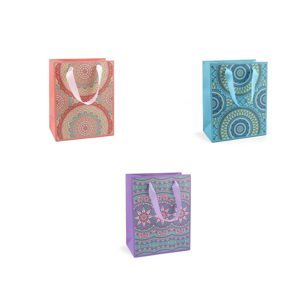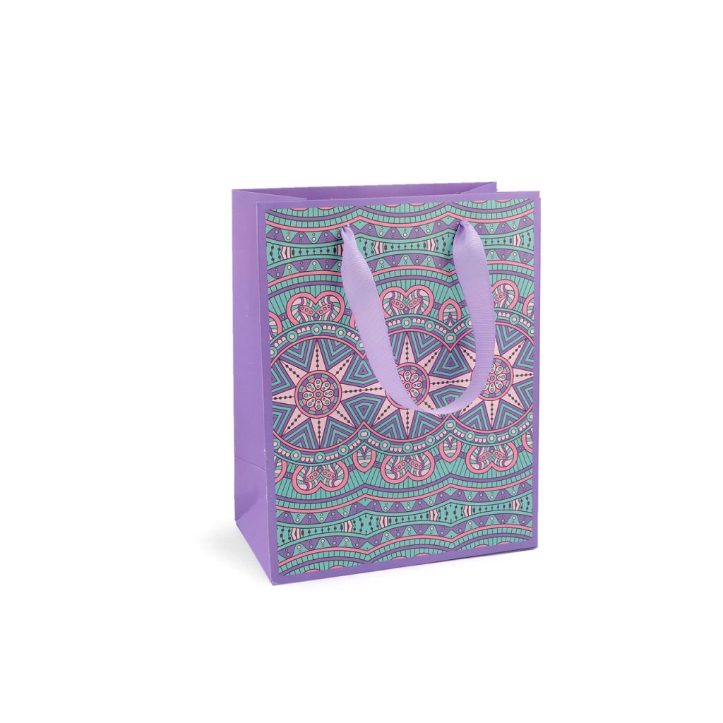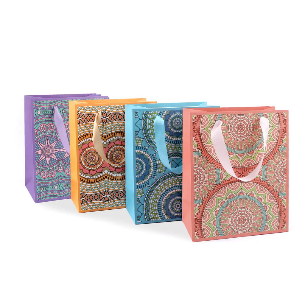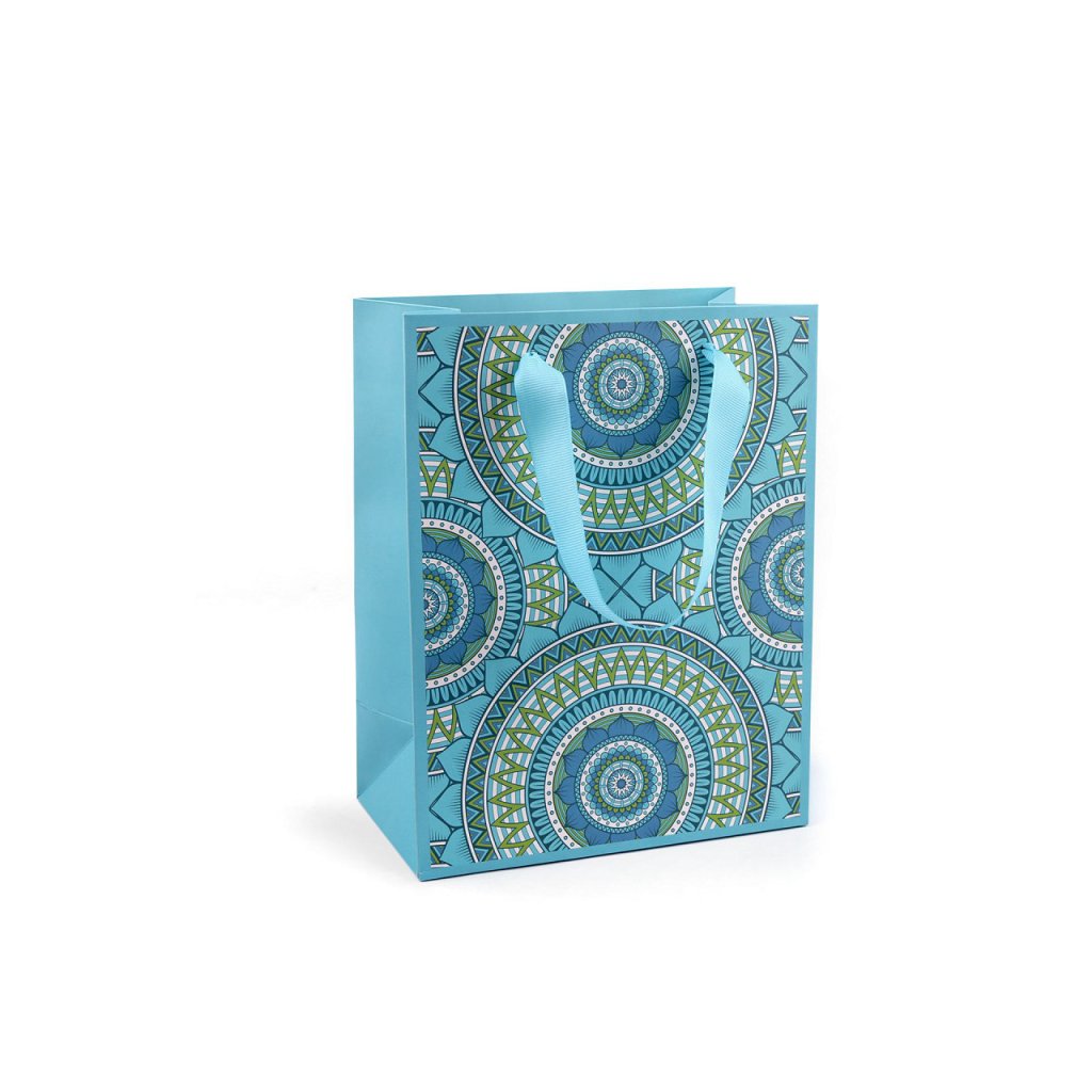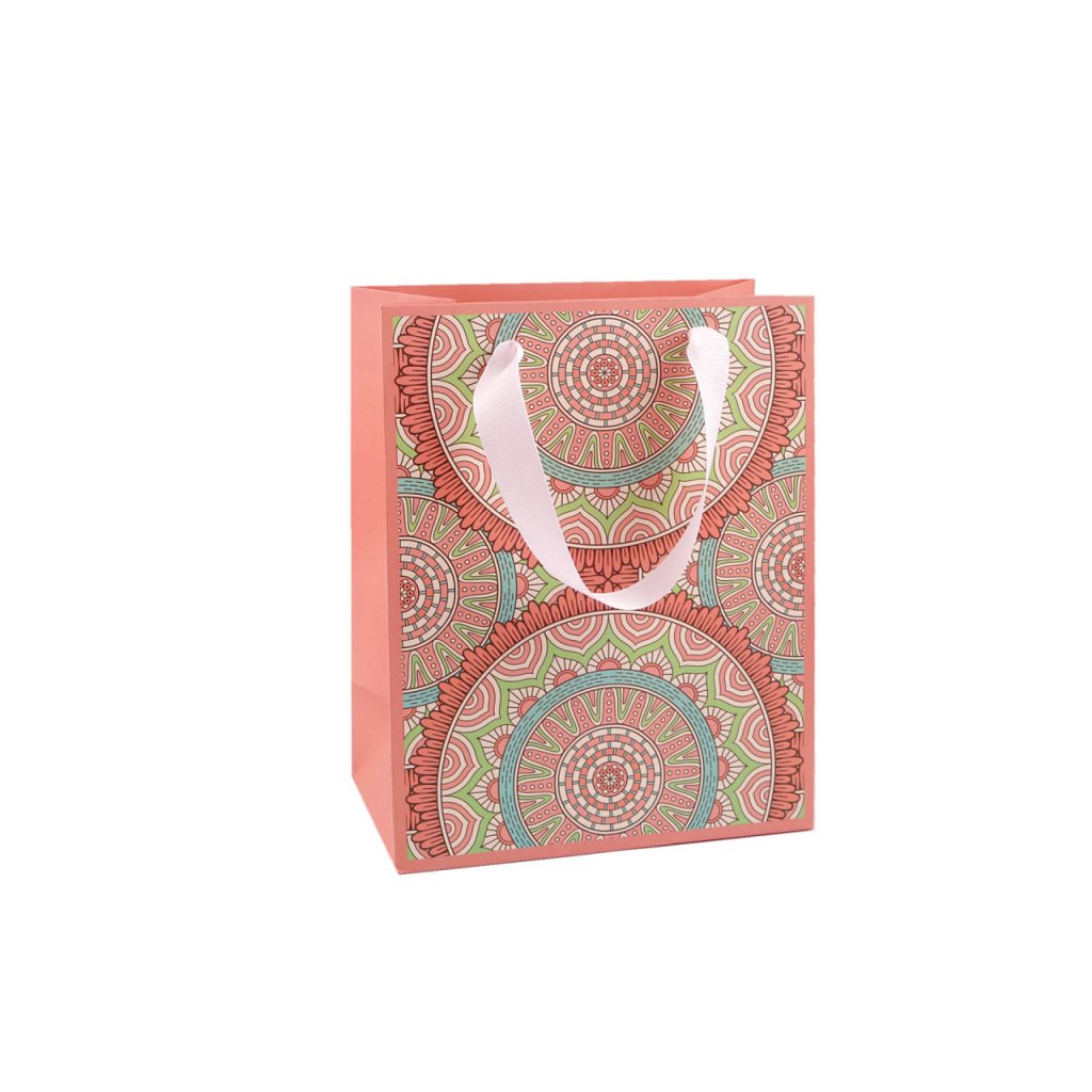 Dárková taška s motivem mandal je vyrobená z kvalitního pevného křídového papíru. Mandaly zdobí přední i zadní stranu tašky. Díky ucha ze stuhy tašku pohodlně uchopíte do ruky. Využijete ji k jakékoliv příležitosti a navíc vám ušetří čas při balení dárků.