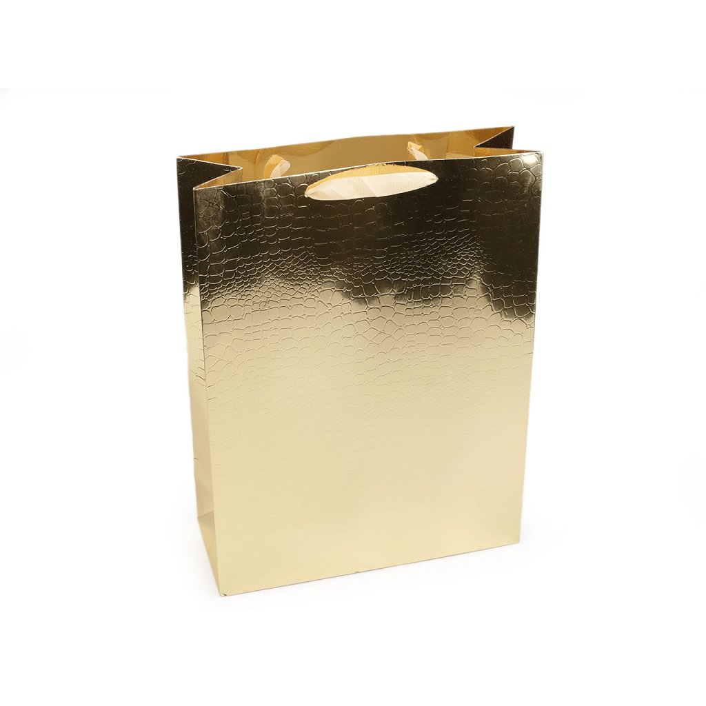Dárková taška s efektním metalickým povrchem se strukturou krokodýlí kůže se hodí na luxusní zabalení velkého dárku. Taška je pevná, vyrobená z kvalitního papíru. Ucha jsou z ploché stuhy, pohodlné do ruky.