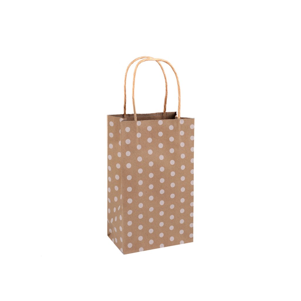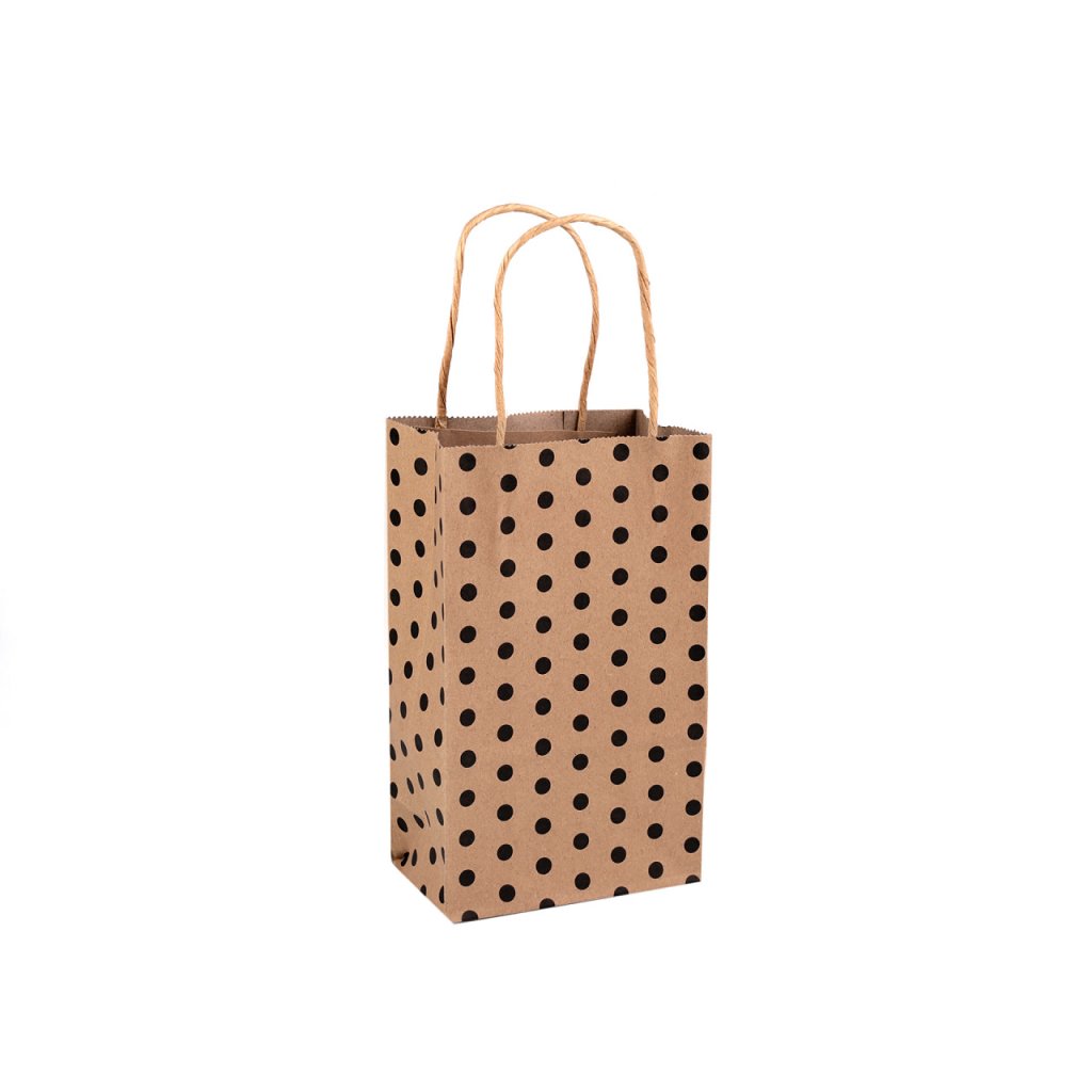 Dárková taška s puntíky je vyrobená z kvalitního pevnějšího papíru. Ucha jsou kroucená a také vyrobená z papíru. Je vhodná k darování dárků, reklamních předmětů apod.