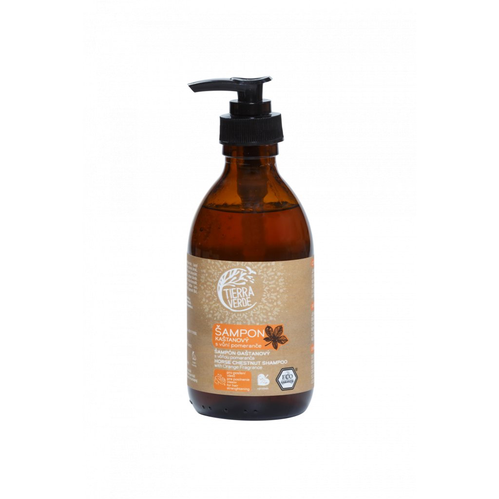 Pečující šampon na bázi výtažku z mýdlových ořechů a jemných tenzidů z kokosového oleje si oblíbí především slabé a namáhané vlasy. Extrakt z BIO kaštanů ze zámecké zahrady ve Slavkově zlepšuje prokrvení vlasové pokožky, působí proti vypadávání vlasů a hřívu celkově posiluje. Díky optimálnímu pH nevysušuje pokožku hlavy a vlasy zanechá sladce voňavé po pomeranči. Svou kvalitou a šetrností si šampon vysloužil certifikaci Eco Garantie, syntetické parfémy, barviva či dráždivé tenzidy v něm tedy budete hledat marně. A balený je ve skle!