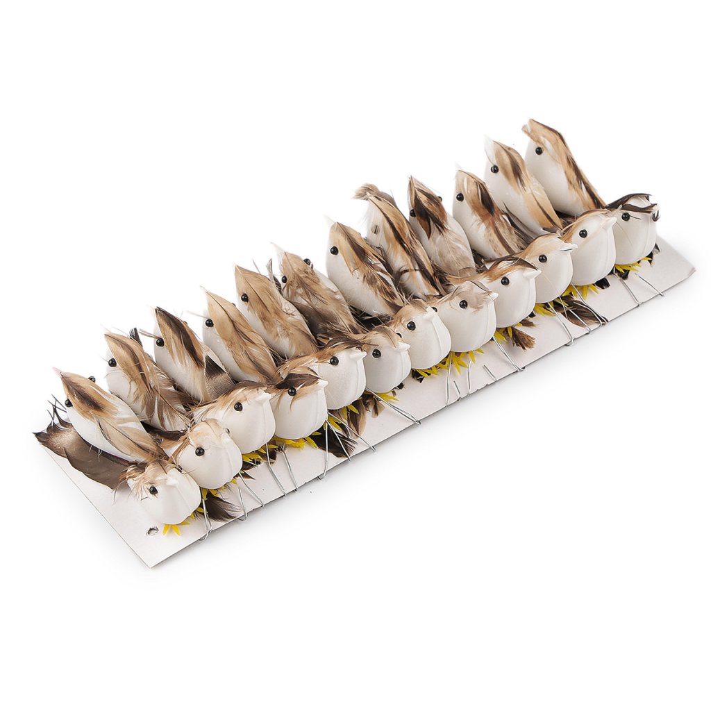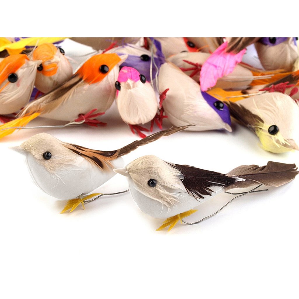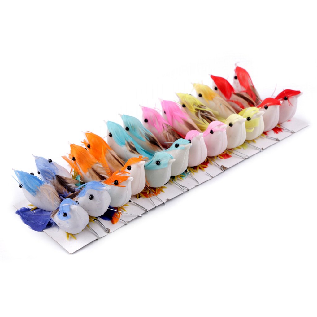 Dekorační ptáček je vyrobený z plastu a jeho tělo pokrývá barevné peří. Na nohách má připevněné dva kovové drátky, díky kterým můžete ptáčka připevnit například na věnec, větvičku, záclonu či ho naaranžovat do květinových vazeb.