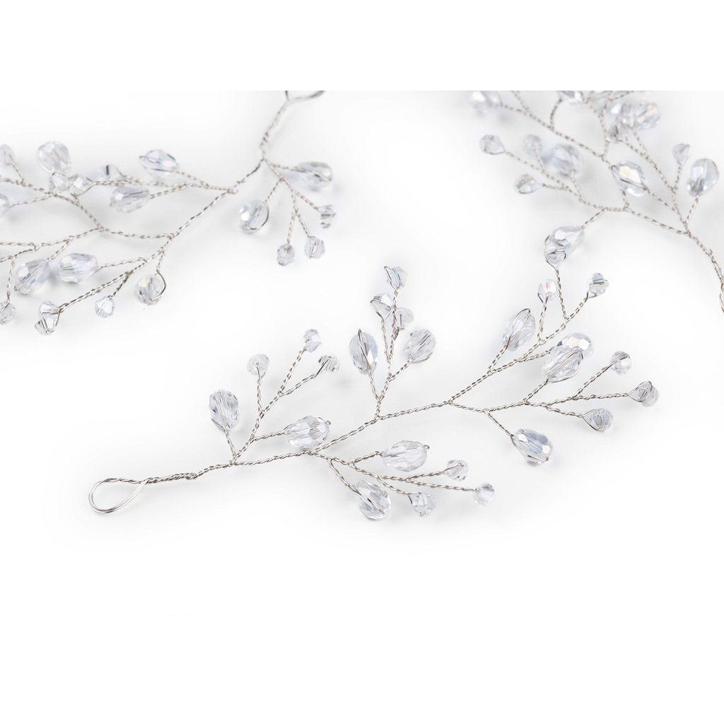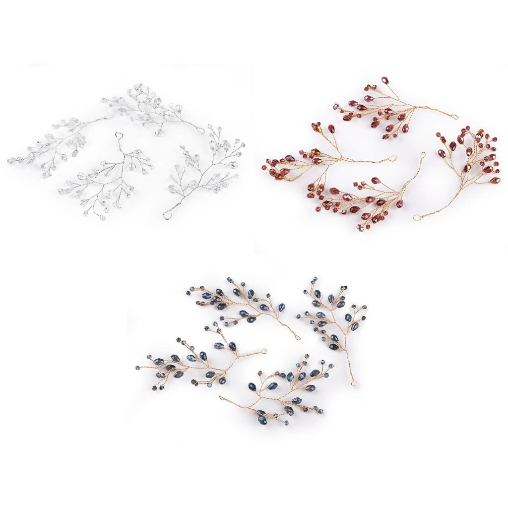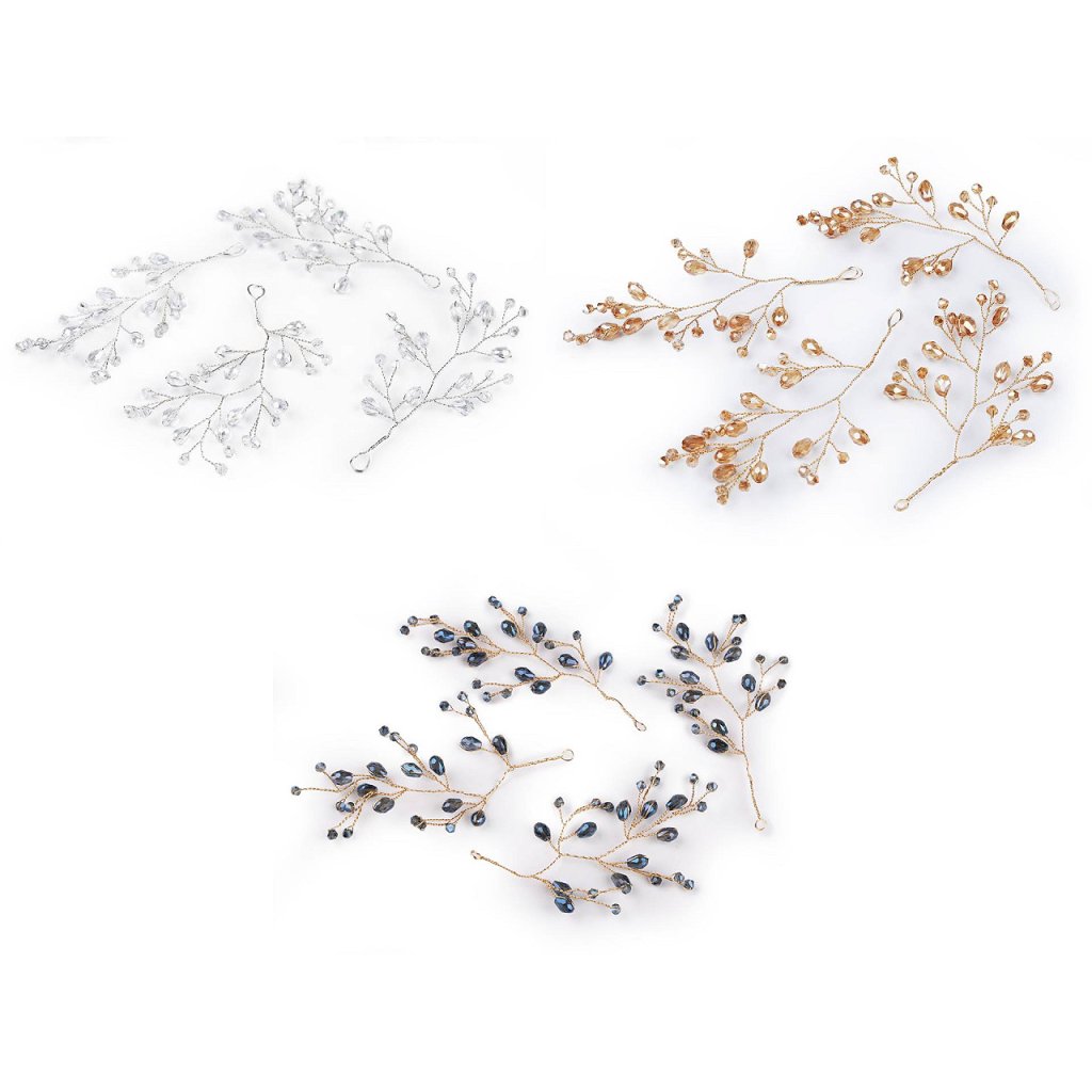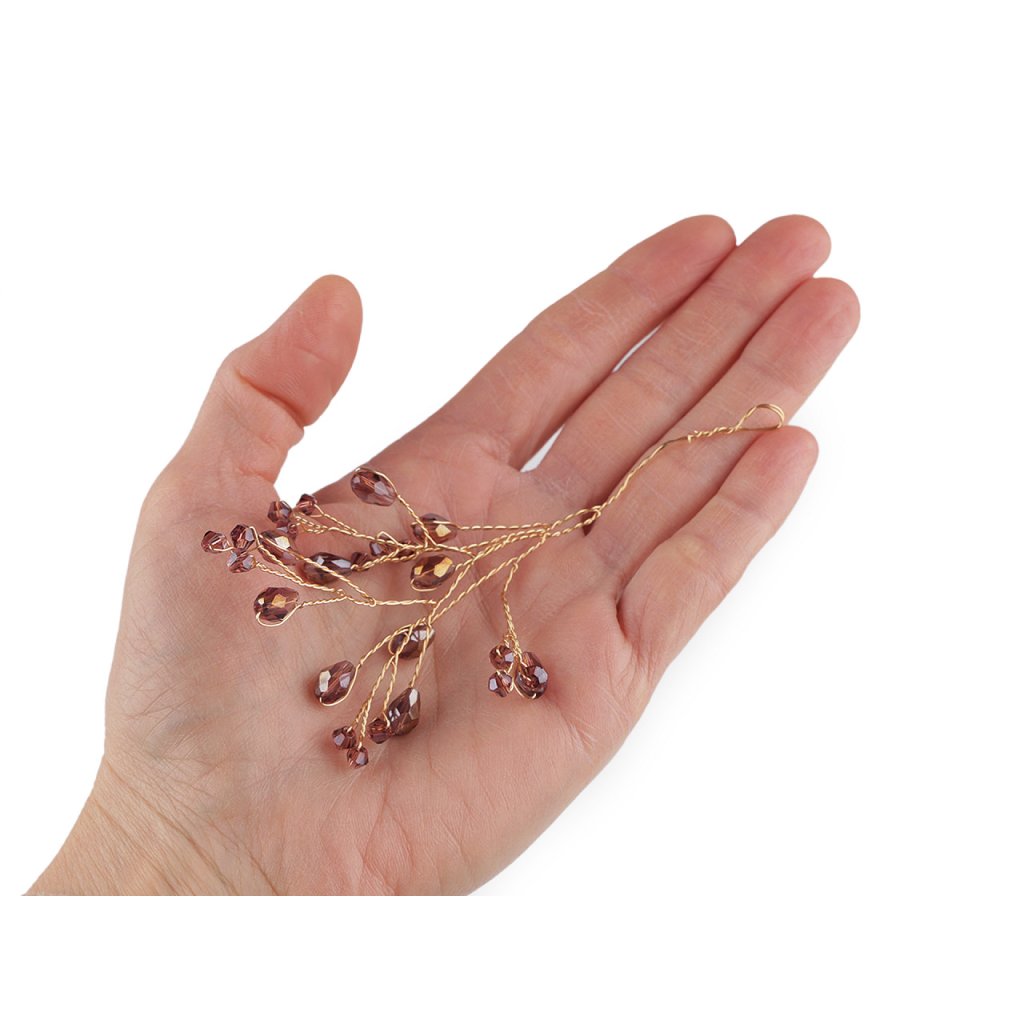 Větvičku s broušenými korálky využijete jako úchvatnou svatební i vánoční ozdobu. Korálky mají povrchovou úpravu s AB efektem, nádherně se třpytí. Větvičku můžete zakomponovat do věnců, svícnů nebo květinových vazeb. Na konci má očko, dá se i zavěsit. Vynikne také volně položená na sváteční tabuli. Hodí se i k výrobě fascinátorů, korunek, věnečků a jiných vlasových doplňků, díky drátkům ji můžete lehce tvarovat.