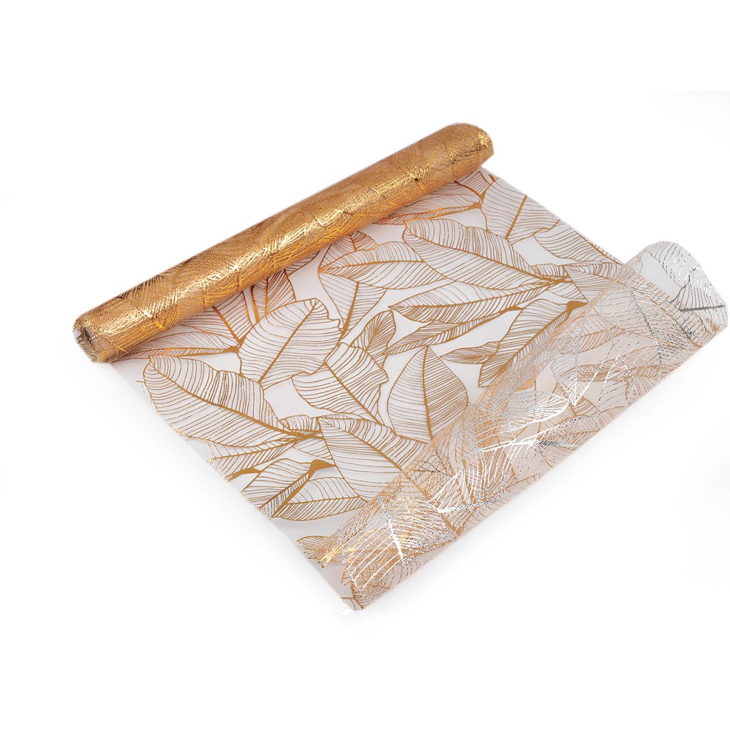 Dekorační tyl působí jemně jako pavučinka a zároveň elegantně. Zdobí ho metalický potisk listů. Tyl vynikne na slavnostní tabuli na svatbách, oslavách, večírcích a plesech. Floristé ho používají i v květinových vazbách.
