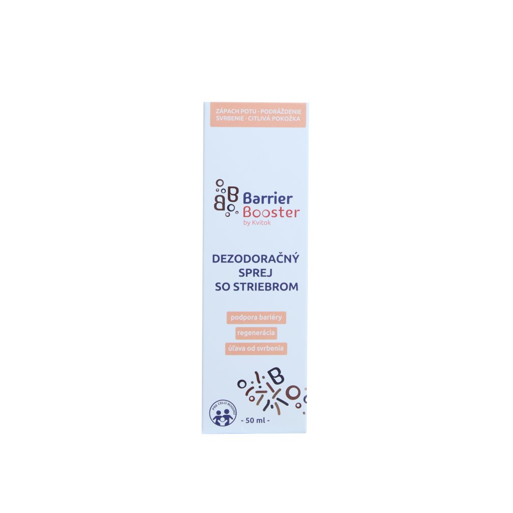 Kvitok Barrier Booster deodorant ve spreji se stříbrem poskytuje jemnou ale účinnou ochranu proti vzniku nepříjemného tělesného zápachu. Díky inovativnímu složení se stříbrem, extraktem ze sečuánského pepře a zinkem účinně předchází množení bakterií způsobujících zápach, zatímco pokožce umožňuje její přirozené pocení. Neobsahuje hliníkové soli, alkohol, esenciální oleje ani alergenní složky, proto je skvělým řešením také pro velmi citlivou pokožku nebo děti od 10 let.. [[rect_deo]]