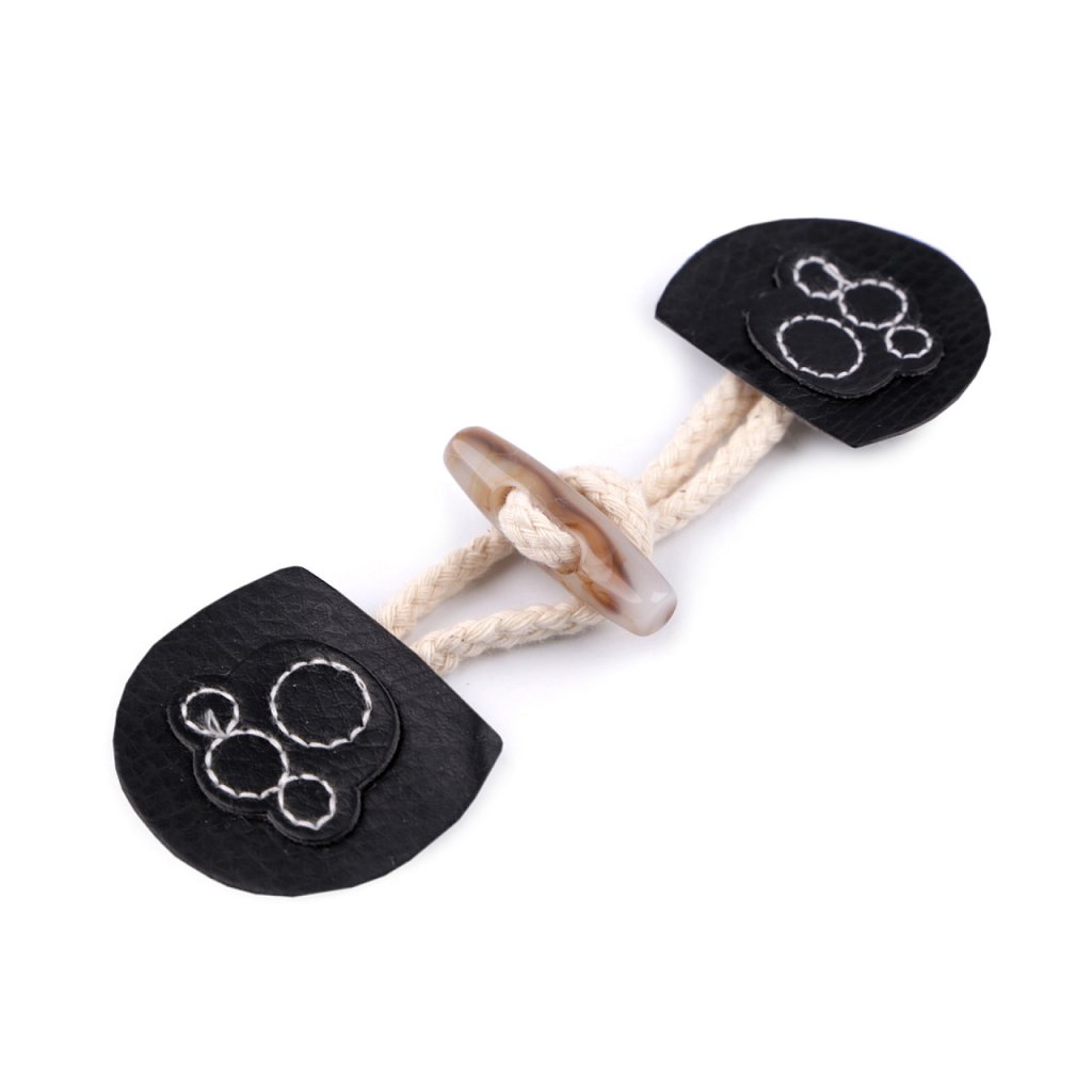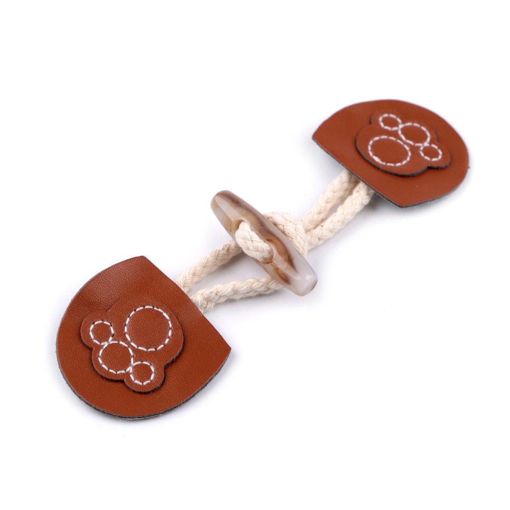 Designové zapínání z eko kůže s olivou zdobí prošití v podobě tlapek. Využijete ho na kabáty, vesty, svetry, mikiny apod. Je vhodné také pro šití duffle coat.