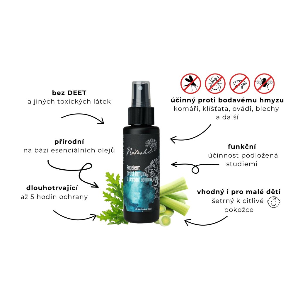 Přírodní sprej s esenciálním olejem z citronely jávské použijte vždy, když se chystáte pobývat v přírodě, parku nebo na zahradě. Má příjemnou citrusovou vůni, která bude pro hmyzí sosáčky krajně nelibá. Ochranný sprej je vegan friendly a pořídit jej můžete rovnou ve dvou velikostech. . [[rect_repel]]