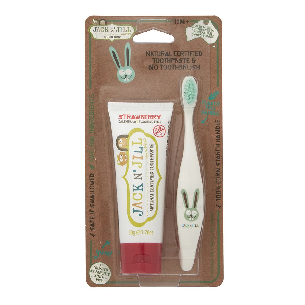 Jack n' Jill Akční set Dětská zubní pasta - Jahoda (50 g) + Dětský zubní kartáček Zajíček - zvýhodněná sada
