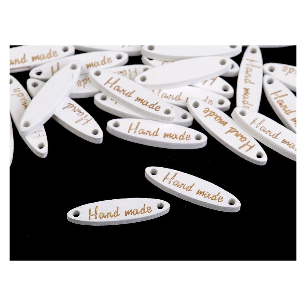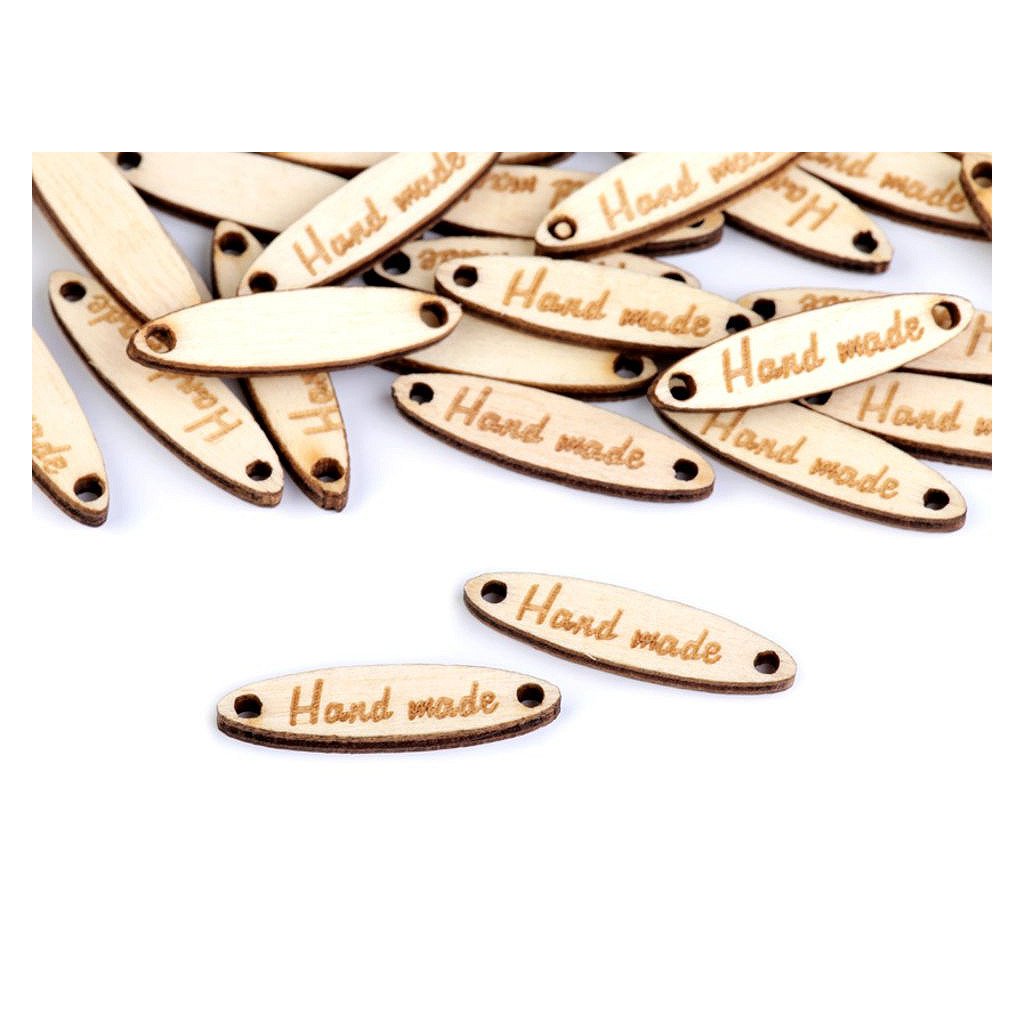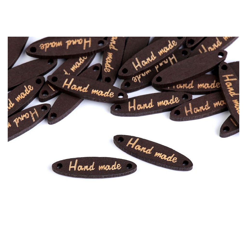 Dřevěnou cedulku oválného tvaru zdobí jednostranný nápis "hand made". Po stranách jsou dírky, kterými lze provléct šňůrku a cedulku tak pověsit na dekoraci.