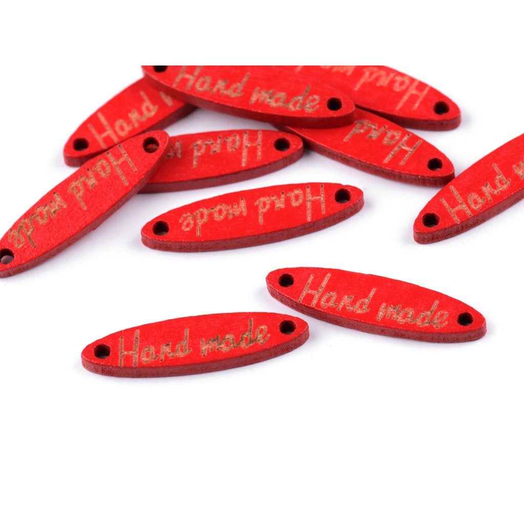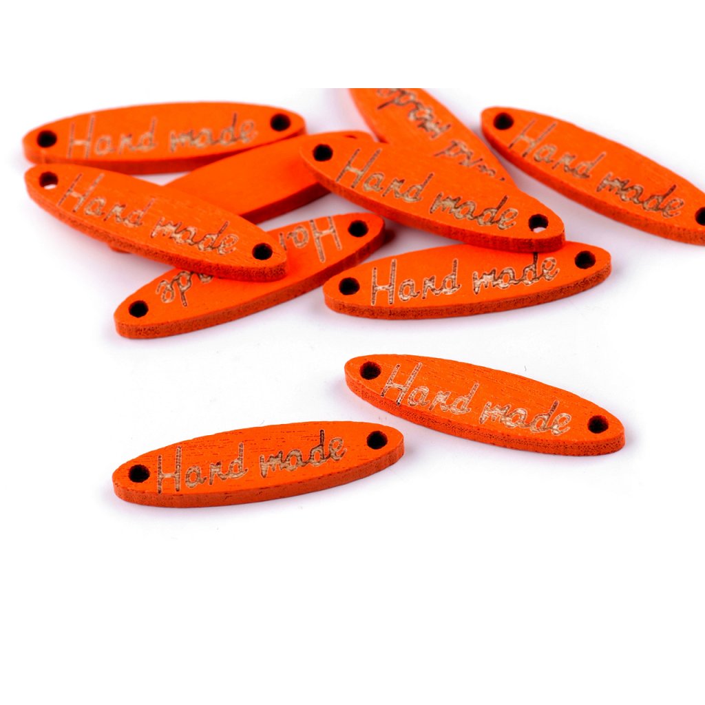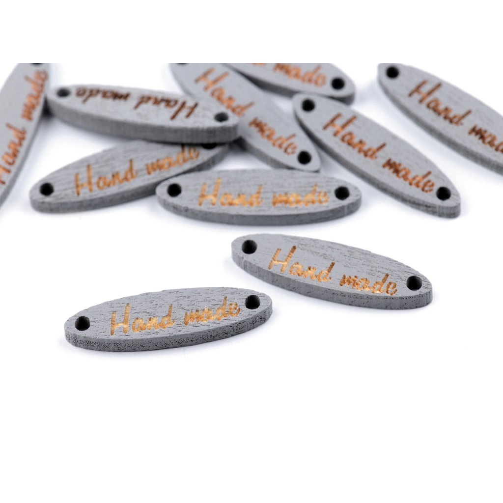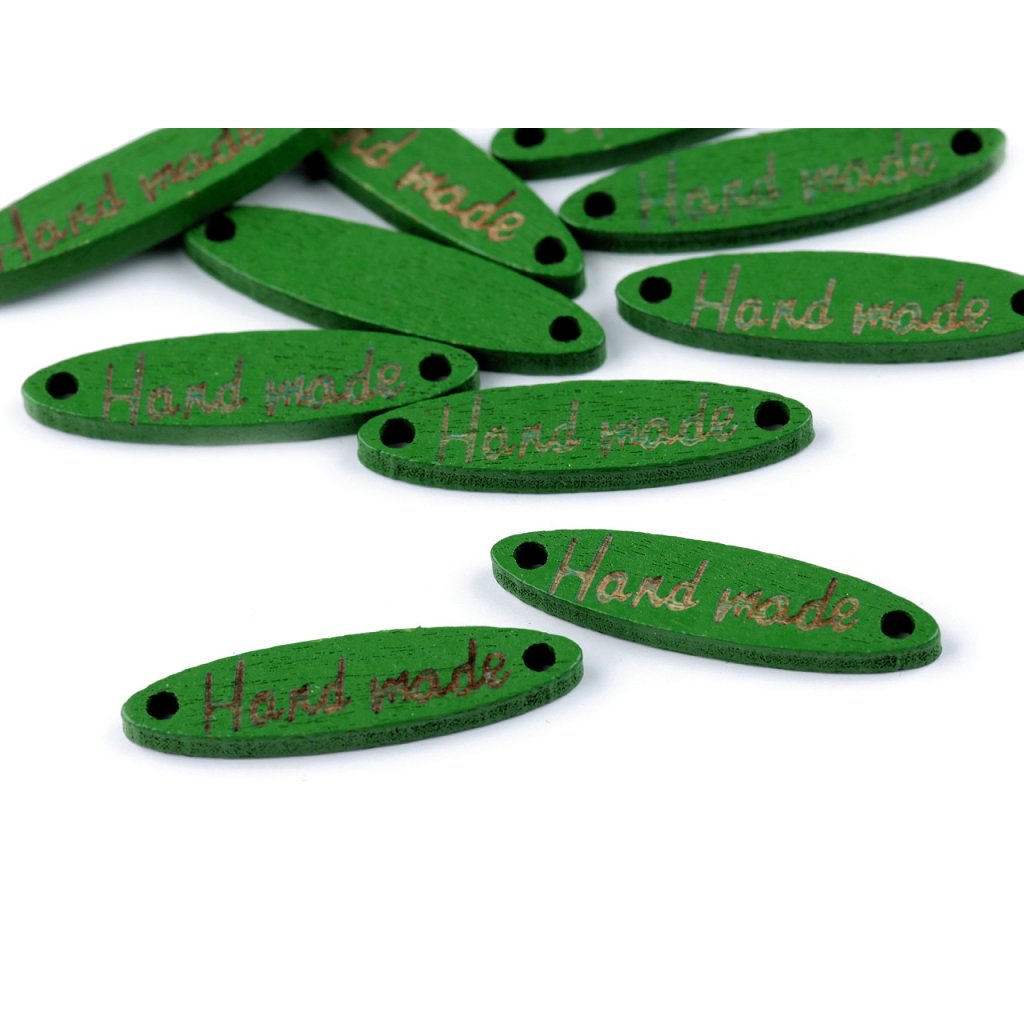 Dřevěnou cedulku oválného tvaru zdobí jednostranný nápis "hand made". Po stranách jsou dírky, kterými lze provléct šňůrku a cedulku tak pověsit na dekoraci.