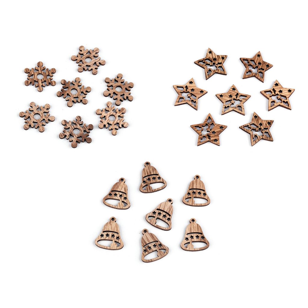 Dřevěné mini vánoční ozdoby můžete nalepit na dárky, věnce, rámečky, pozvánky, jmenovky, dřevěné kolíčky apod.