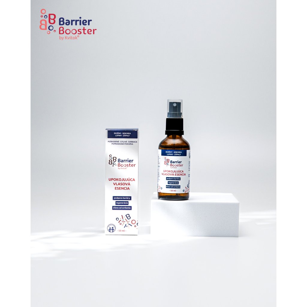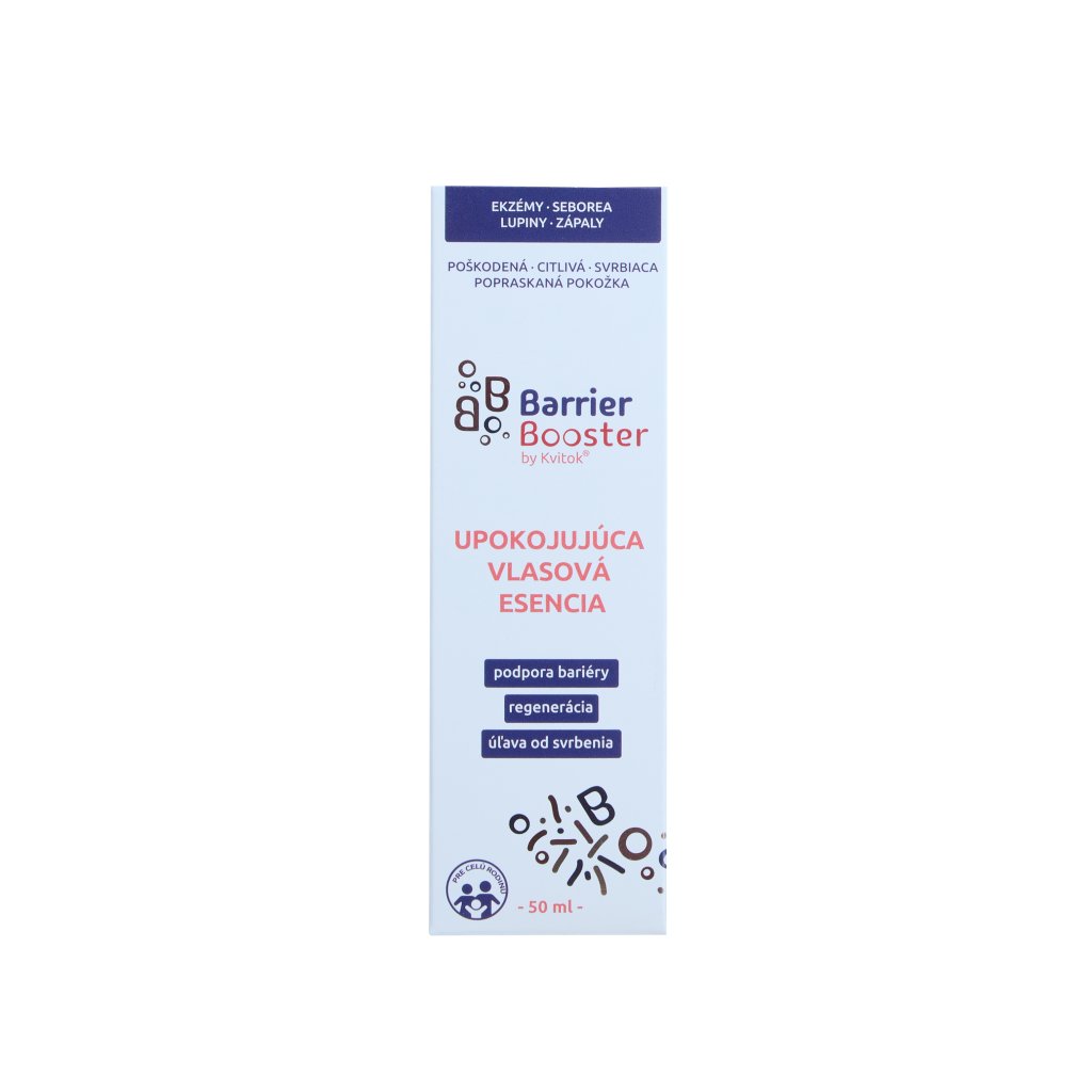 Zklidňující vlasová esence Kvitok Barrier Booster účinně pečuje o citlivou, suchou, svědivou či podrážděnou vlasovou pokožku se sklonem k ekzému nebo seboree. Esence jemně hydratuje a zklidňuje pokožku hlavy bez zatížení vlasových kořínků. Díky speciálnímu složení pomáhá obnovit zdraví kožního mikrobiomu, posiluje přirozenou kožní bariéru a přispívá k celkové vitalitě podrážděné pokožky hlavy. Jemné složení je obohaceno o levandulovou vodu a ovesné extrakty, které zvyšují komfort a regeneraci vlasové pokožky i při každodenním používání.. PROKLEPNUTO: Jak si vlasová esence vedla na svědivé pokožce plné boláků způsobenými syndromem mnohočetné chemické přecitlivělosti (MCS)? Jestli strčila kortikoidy do kapsy, zjistíte v upřímné recenzi na našem blogu.