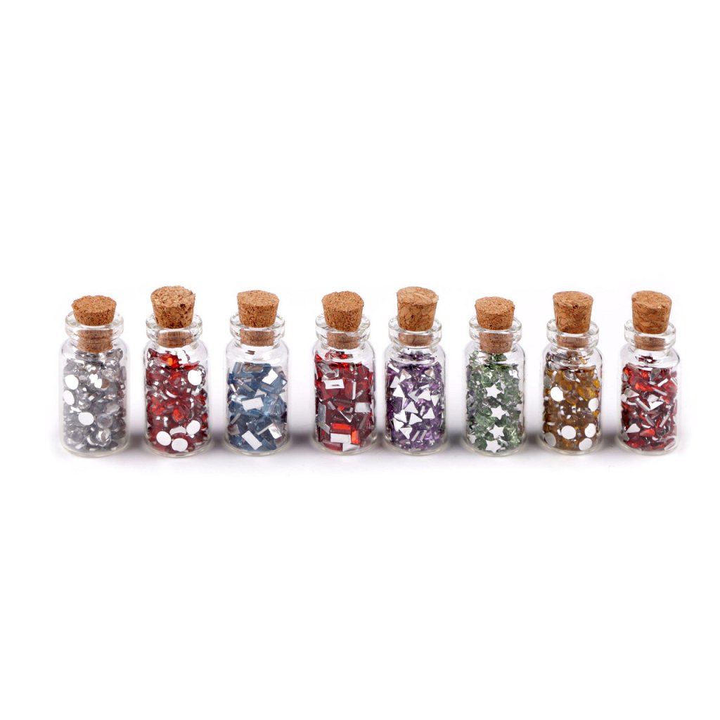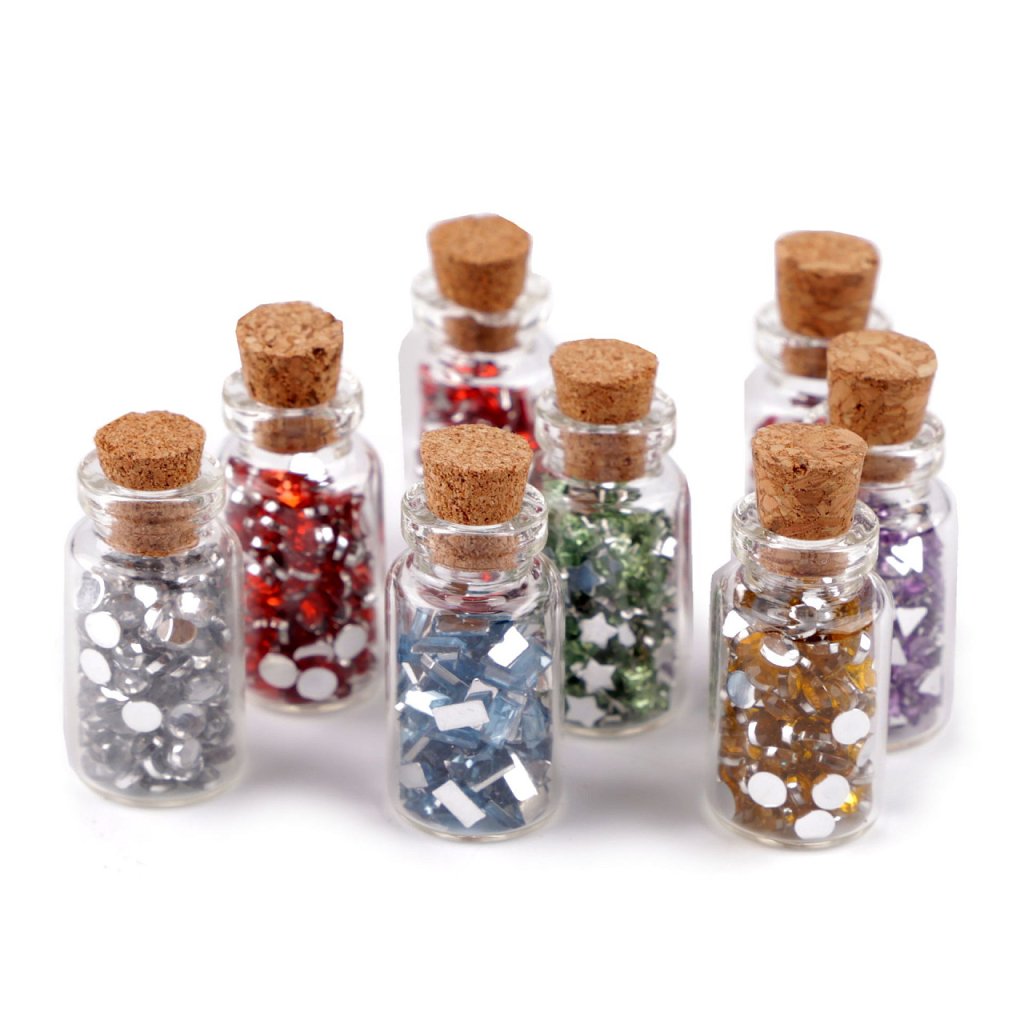 Sada 8 skleněných lahviček s mini plastovými kamínky se hodí na dozdobení mozaiky, nalepení na přáníčka apod. Kamínky dodají třpyt a originalitu všem vašim projektům. Hodí se k nalepení na materiály jako je plast, dřevo, kámen, kov, keramika a jiné. Zadní strana je hladká se stříbrným zátěrem. Skleničky se uzavírají korkem. Kamínky můžete ozdobit kartónové a dřevěné krabičky, květináče, šperkové polotovary, skleněné vázy, svícny, lahve, amfóry, kameny apod.
