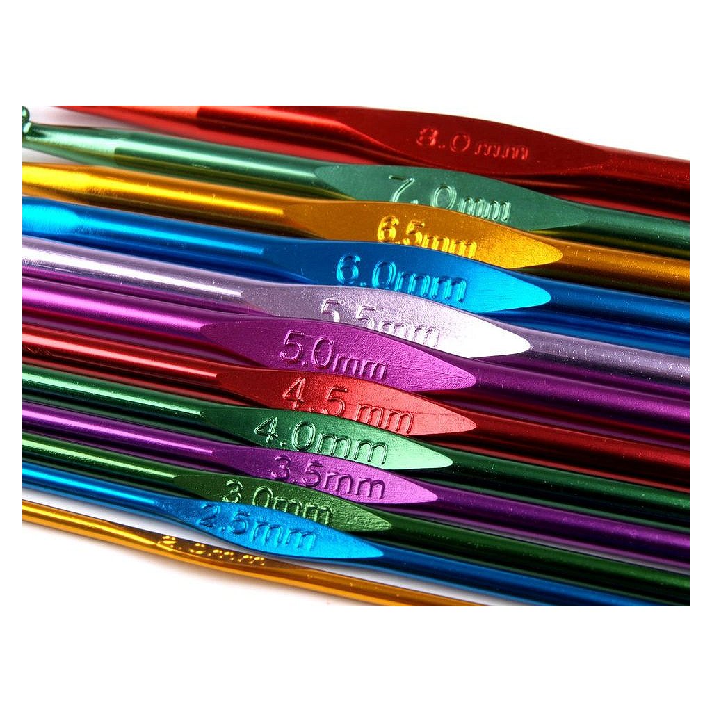 V jedné sadě naleznete 12 hliníkových háčků následujících velikostí: 2; 2,5; 3; 3,5; 4; 4,5; 5; 5,5; 6; 6,5; 7 a 8 mm. Háčky mají různé barvy. Tento sortiment jistě ocení každá žena, která ráda háčkuje.