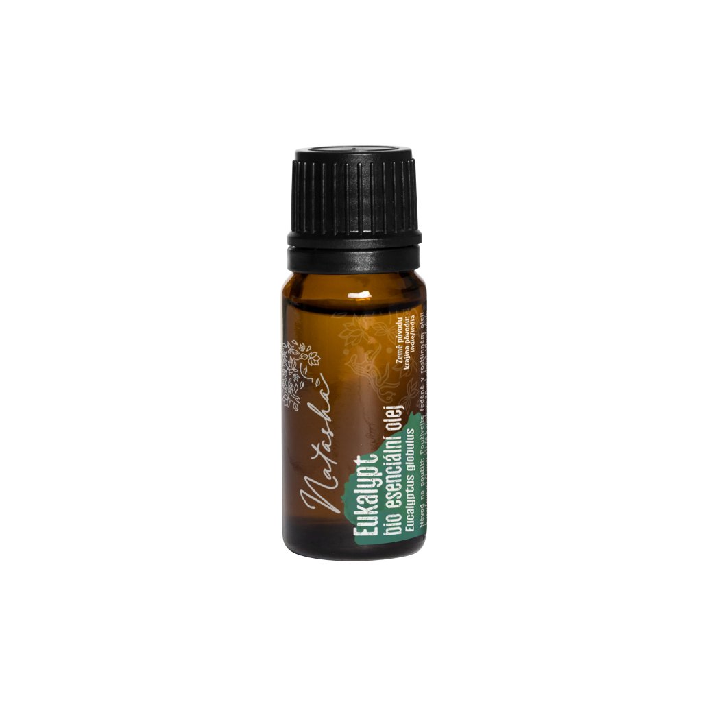 Natasha Esenciální olej BIO (10 ml) - Eukalypt je univerzální přírodní pomocník pro dýchací cesty s osvěžující a lehce dřevitou vůní, která navozuje pocit čistoty a pohody. Tento 100% organický esenciální olej pochází z ekologicky certifikovaných rostlin, zpracovaných bez použití chemikálií, a dodává se s prestižní certifikací Ecogarantie. Díky svým pozitivním účinkům na dýchací systém a povzbuzujícím vlastnostem je ideální přísadou na výrobu masážních balzámů na hrudník nebo jako součást domácích aroma difuzérů. Vychutnávejte si přírodní péči s tímto kvalitním esenciálním olejem ve vašem každodenním životě.