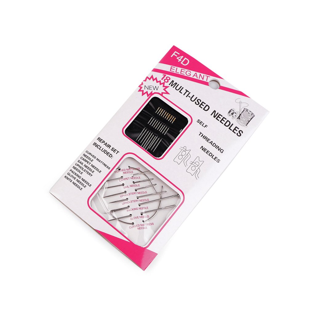 Sada jehel obsahuje 10 jehel pro špatný zrak se speciálně tvarovaným ouškem, kdy nit navléknete jednoduchým nasunutím shora ouška a malá pojistka zajistí, že ani při provlékání hustou tkaninou nit z jehly nevyklouzne. Dále zde najdete 2 čalounické jehly na matrace, jehlu na koberce, jehlu na plachtovinu, trojhrannou jehlu na plátno, jehlu na kůži a 2 čalounické jehly.