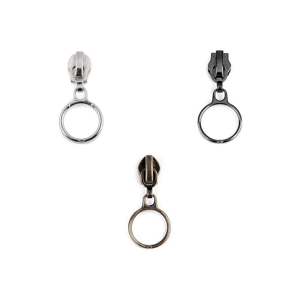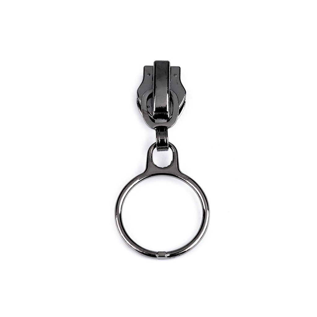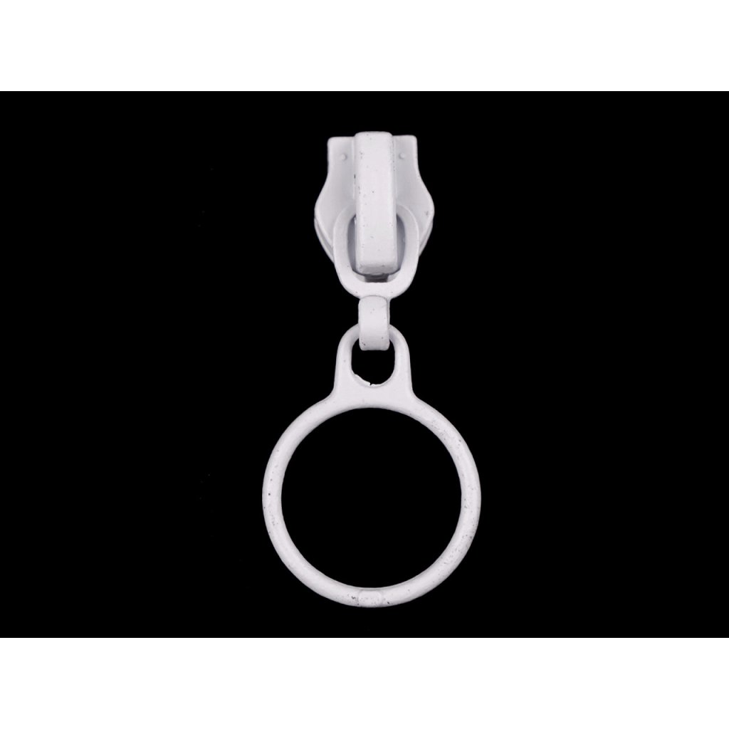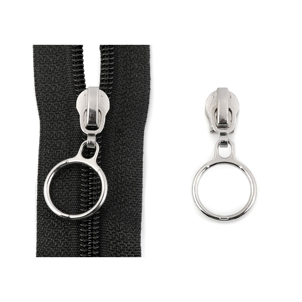 Kovový jezdec s táhlem v podobě kroužku je určený ke spirálovým zipům v metráži, které u nás najdete pod kódem 790304, 800963, 750994, 750503, 790305.