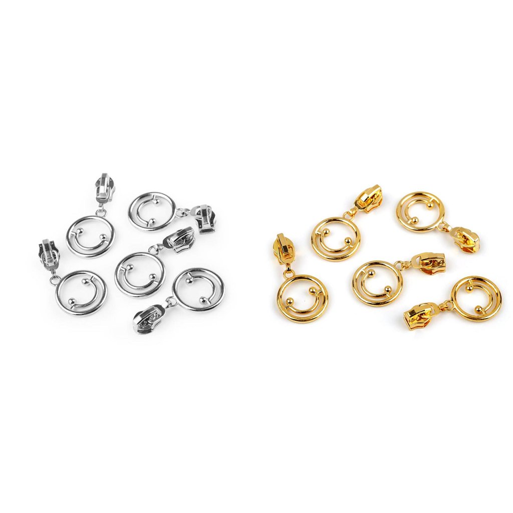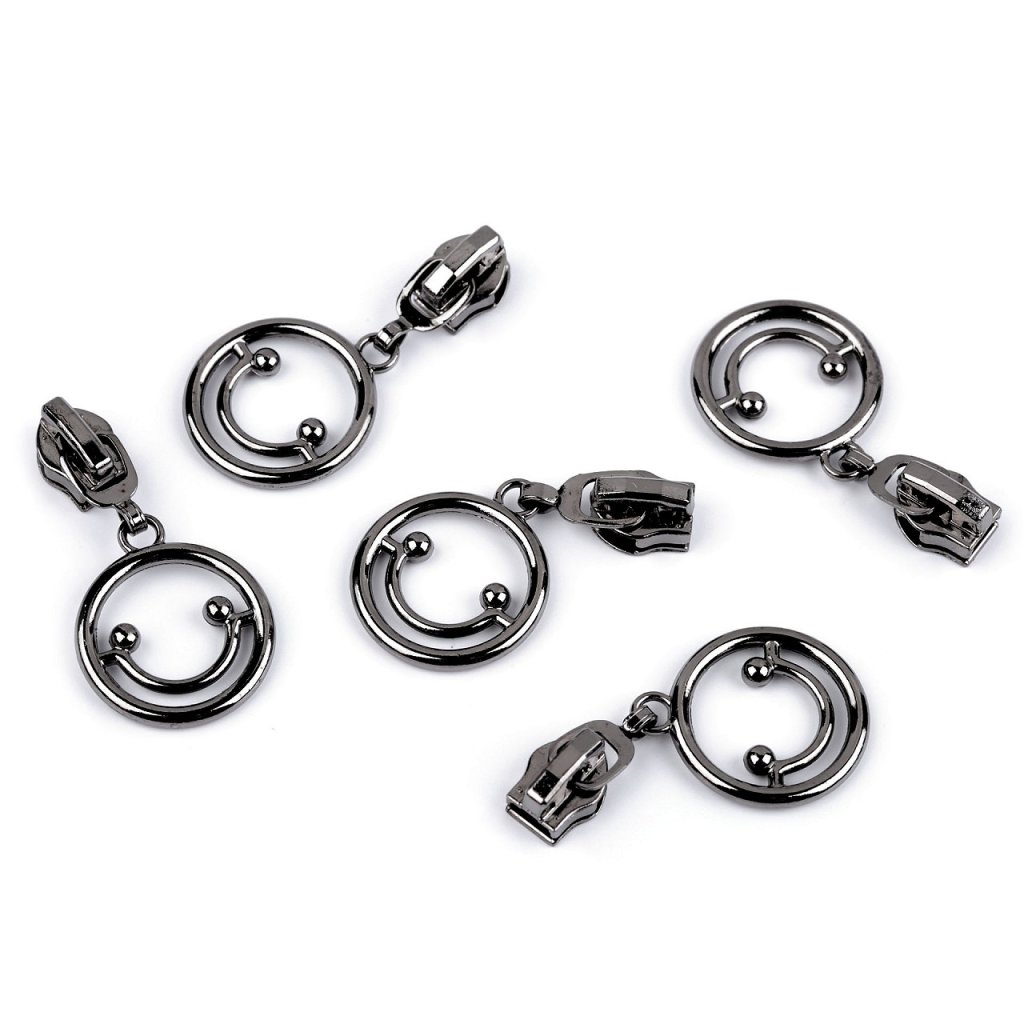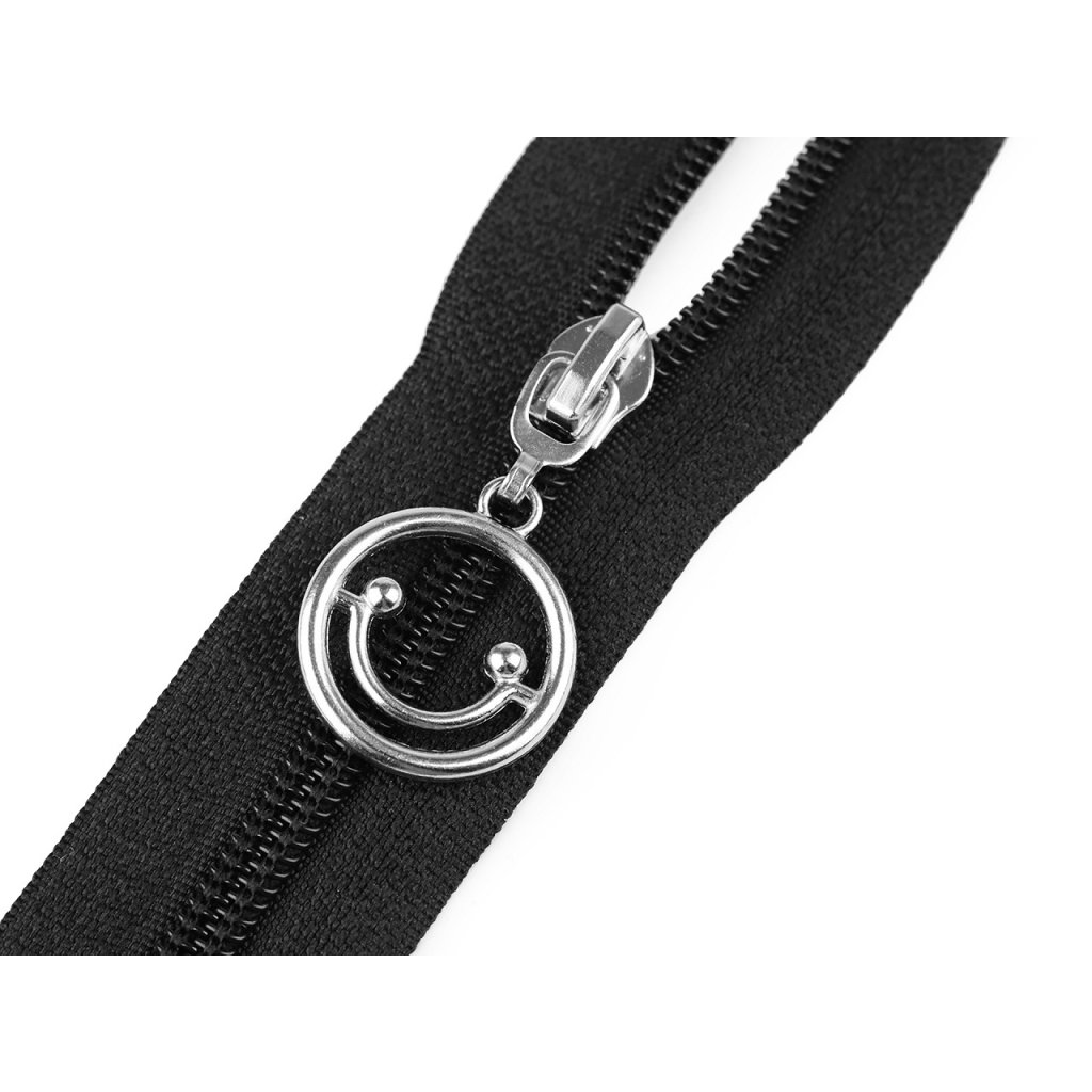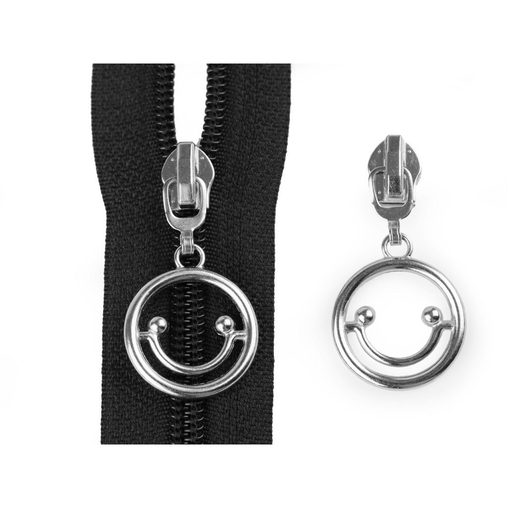Kovový ozdobný jezdec má tvar smajlíka. Je s aretací, což znamená, že zip zůstává rozevřený pouze tolik, kolik si přejete.